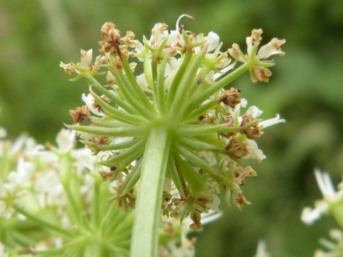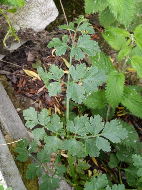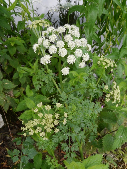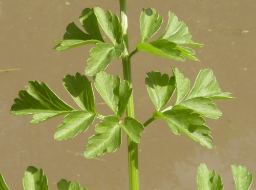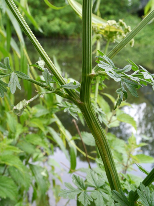 Tall, hairless, parsley scented plant to 1.5 metres. Stem hollow. Basal leaves 3 to 4 pinnate with broad oval or rounded leaflets, lobed and toothed. Stem leaves 2 to 3 pinnate with narrower leaflets. Flowers white, 2 mm in umbels with 10 to 40 rays, not thickened in fruit. Bracts linear.
