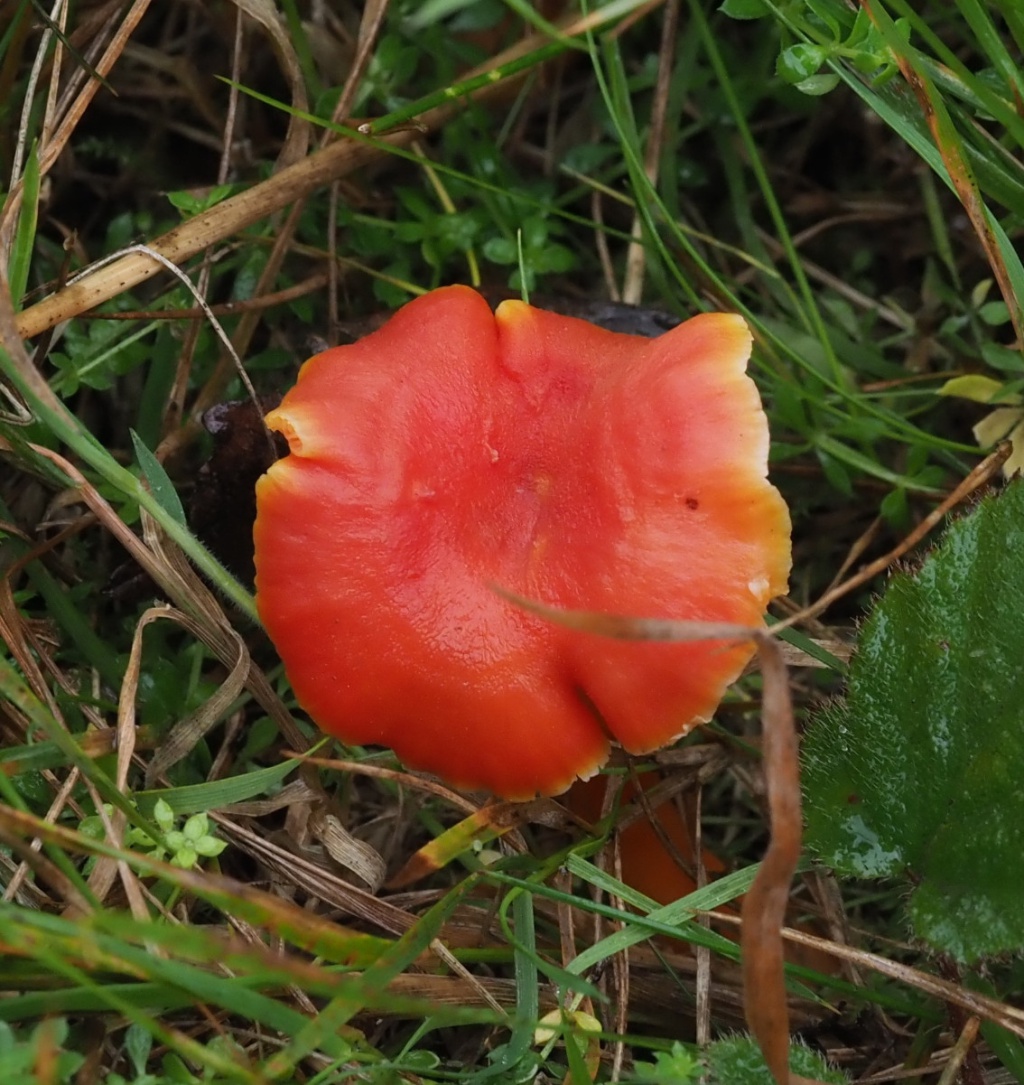 A small fungus with a cap diameter of 1 to 4.5 cm. The cap is a bright rich orange-red in colour when younger, but fading to a dull or pinkish-orange with age. Unlike many other orange and red waxcaps, it has a dry cap that become flaky with age. The cap is initially convex becoming depressed at the centre. Gills are decurrent and paler than the cap. The crushed stipe and cap have a pleasant sweet smell of honey.