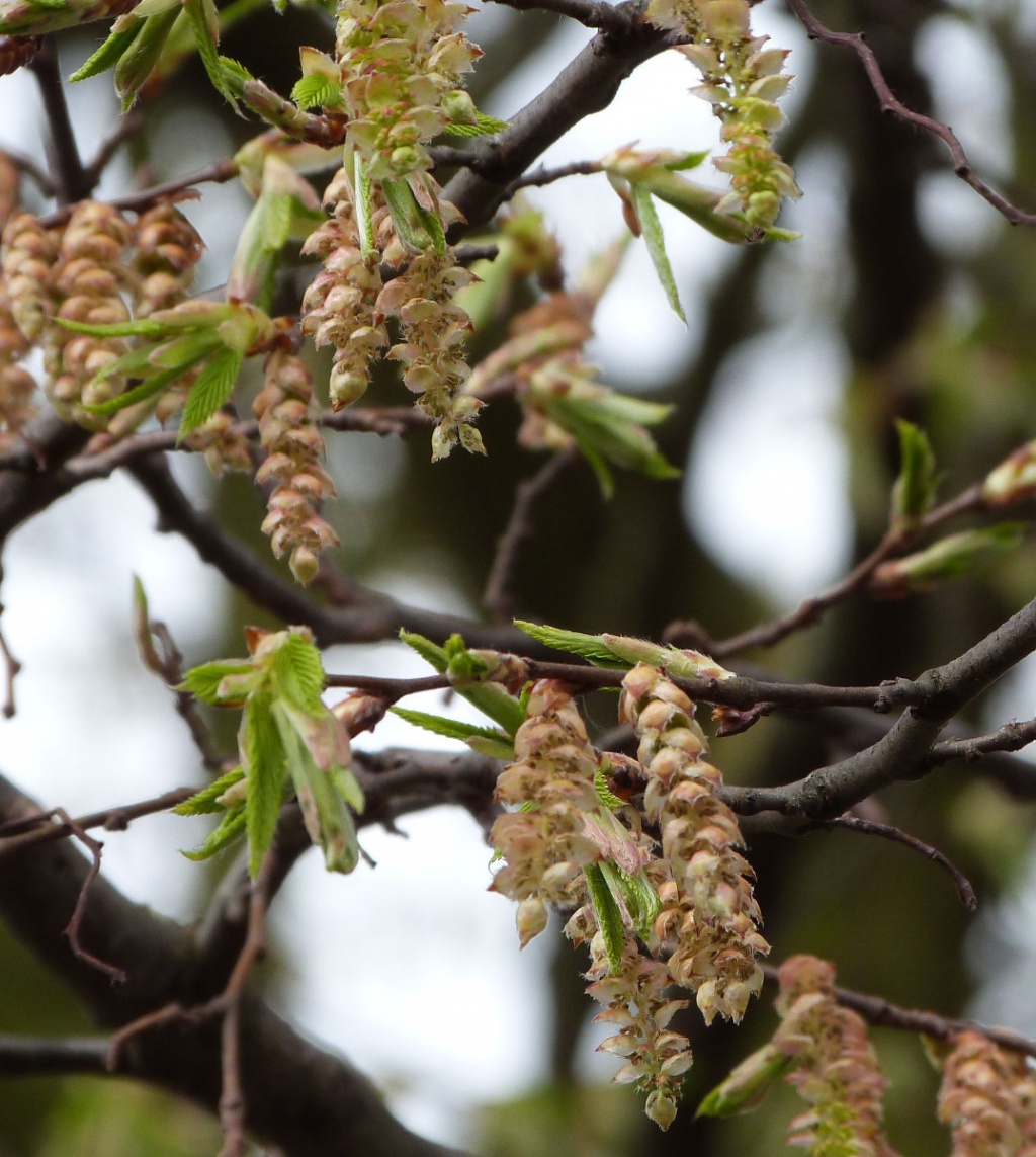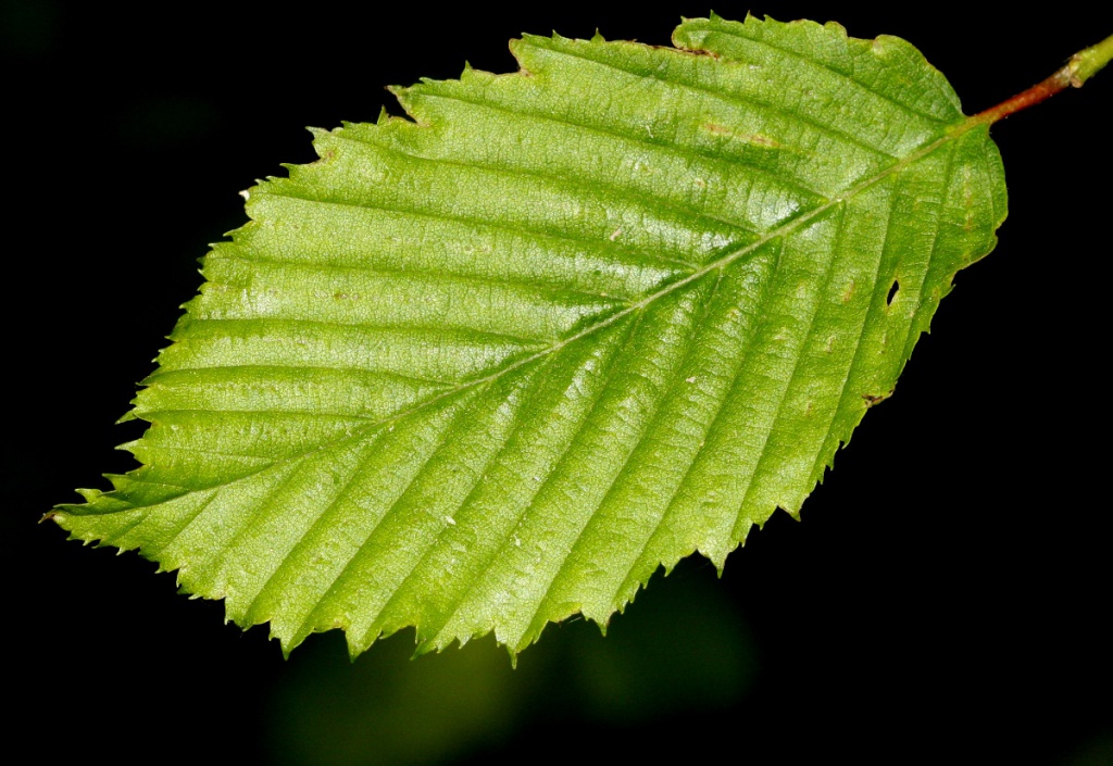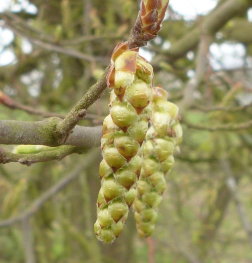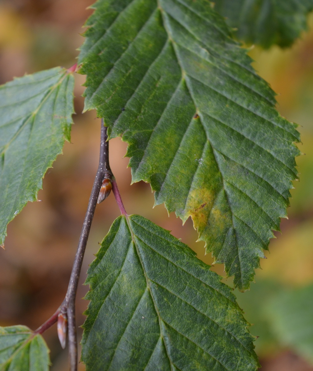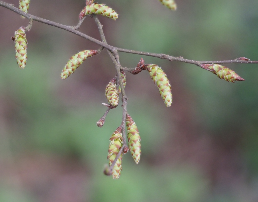 Tree to 25 metres. Leaves oval, pointed looking somewhat pleated and sharply toothed. Catkins greenish to 5 cm borne with the leaves. Fruit in pendent clusters surrounded by three lobed bracts; small nuts.