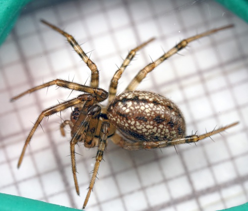 Relatively easy to identify, this is a stunningly marked and colourful spider. The pinkish mottled body has a darker central band of varying strength. The head is light brown and also has a darker central line.