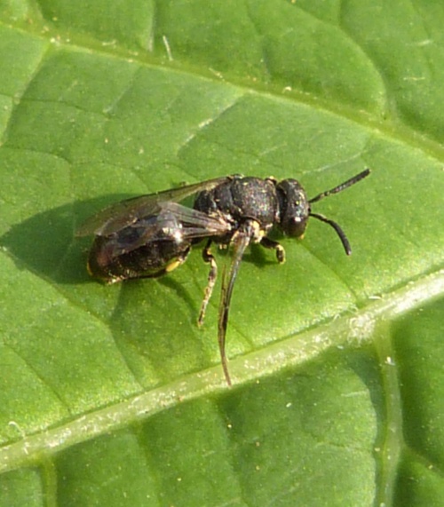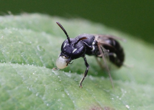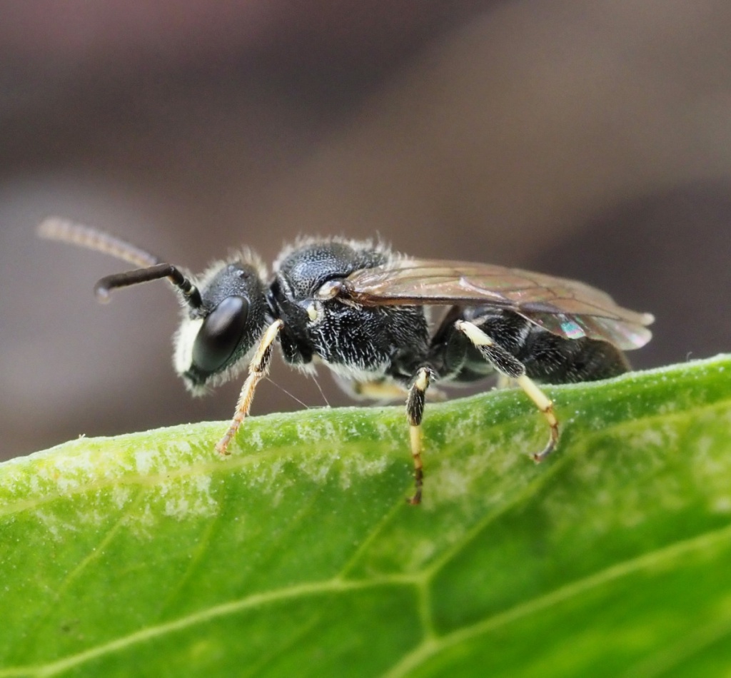 A very small and mainly black bee. The male has a striking white face (this characteristic is not restricted solely to this species) and the hind legs are banded with black and creamy yellow. The female has paired white spots on the face.