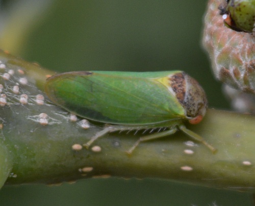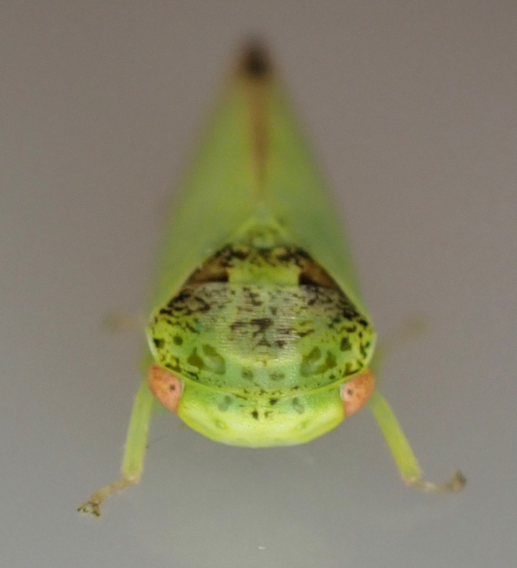 A large leafhopper, 6.5 to 8 mm, on oak, with a broad head. The forewings range from green to pale brown and the vertex, pronotum and scutellum are spotted and mottled with brown.