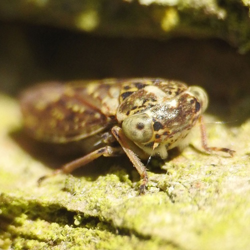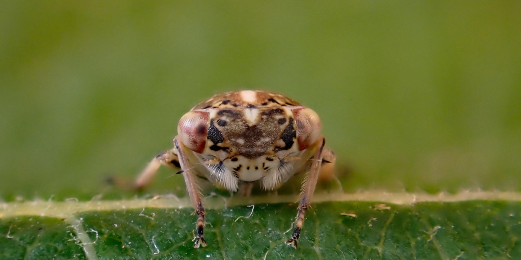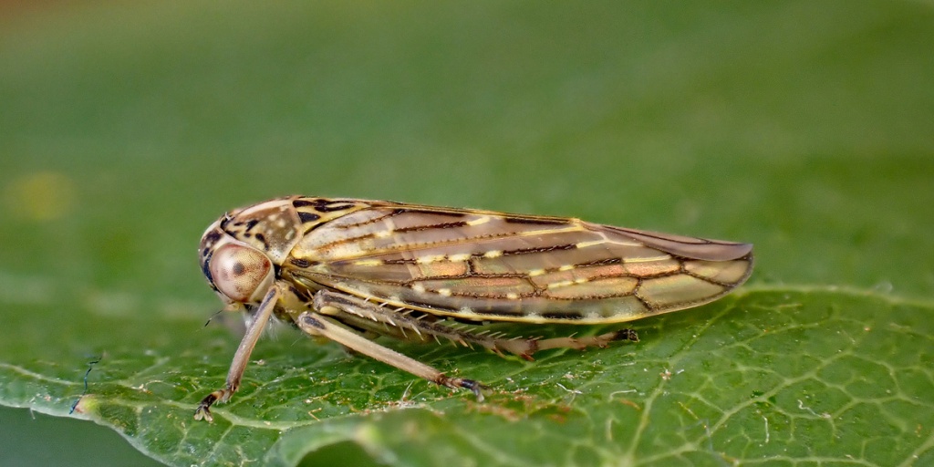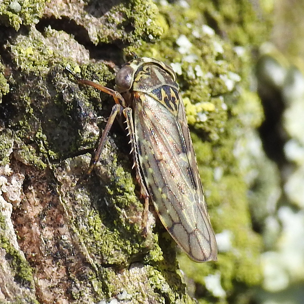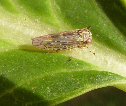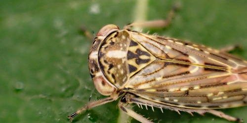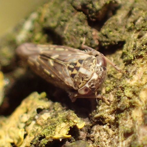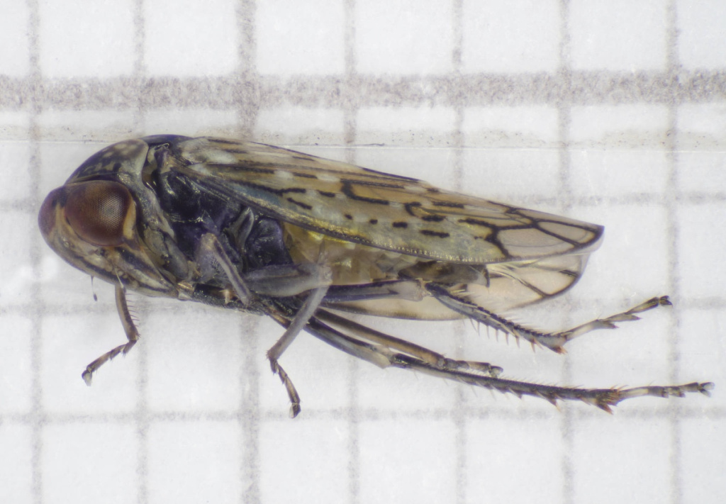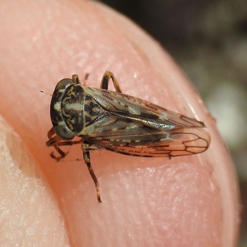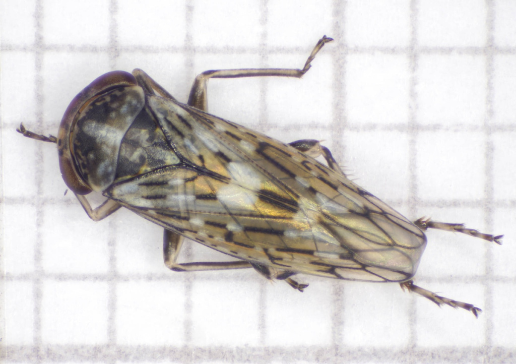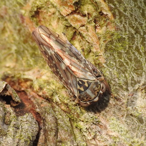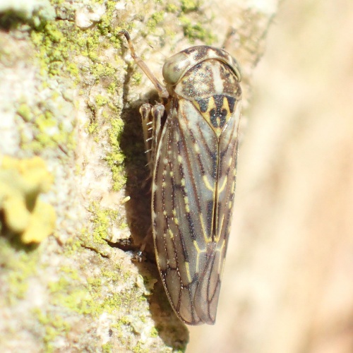 Length 6 to 7 mm. The forewings are whitish/greyish,veins that have alternate light/dark sections. The broad pale band down the pronotum, the scutellum markings of 3 triangles and a horseshoe shape, and the pattern of spots on the face can be diagnostic. The genae ('cheeks') are pubescent - the male has longer, denser hairs.