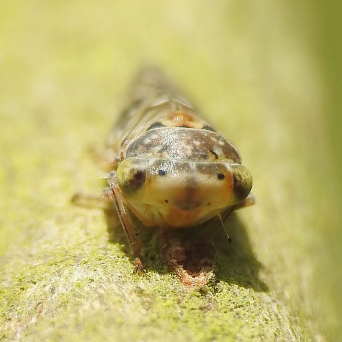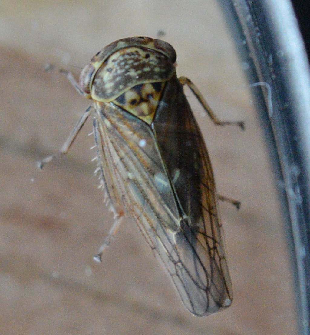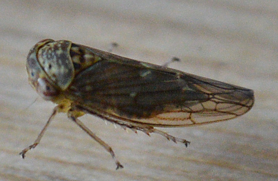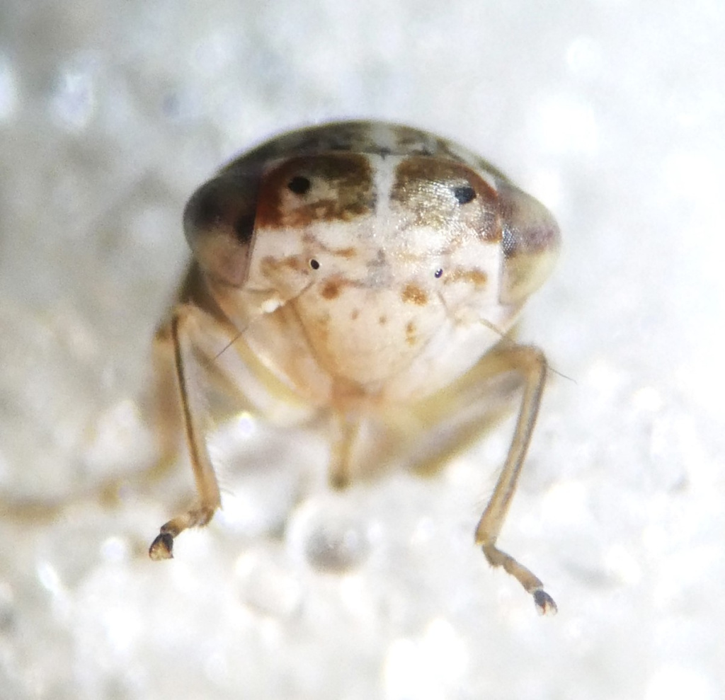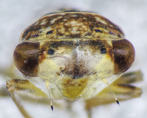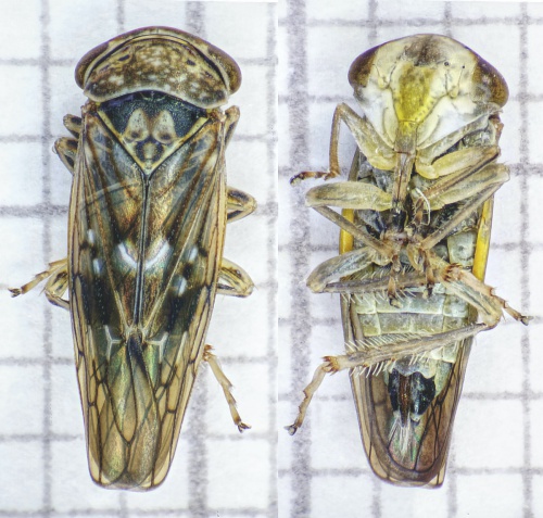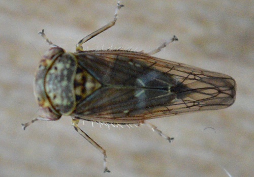 Length 5.5 to 6.5 mm. The forewing is brownish, mottled with white spots and a faint dark band. The face is mostly light; the distance between ocelli is greater than the distance from ocellus to antennal base.