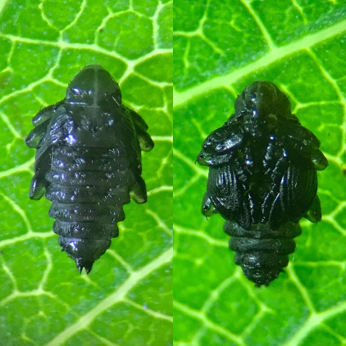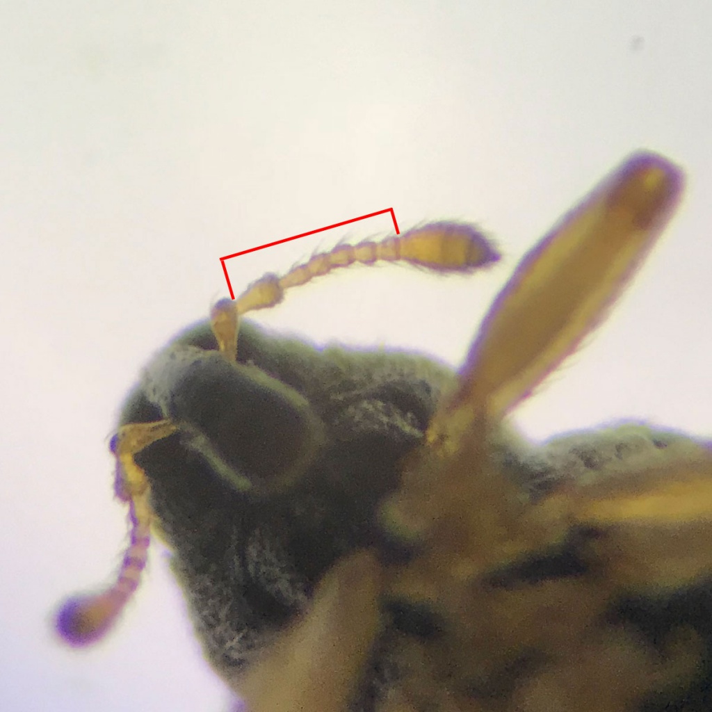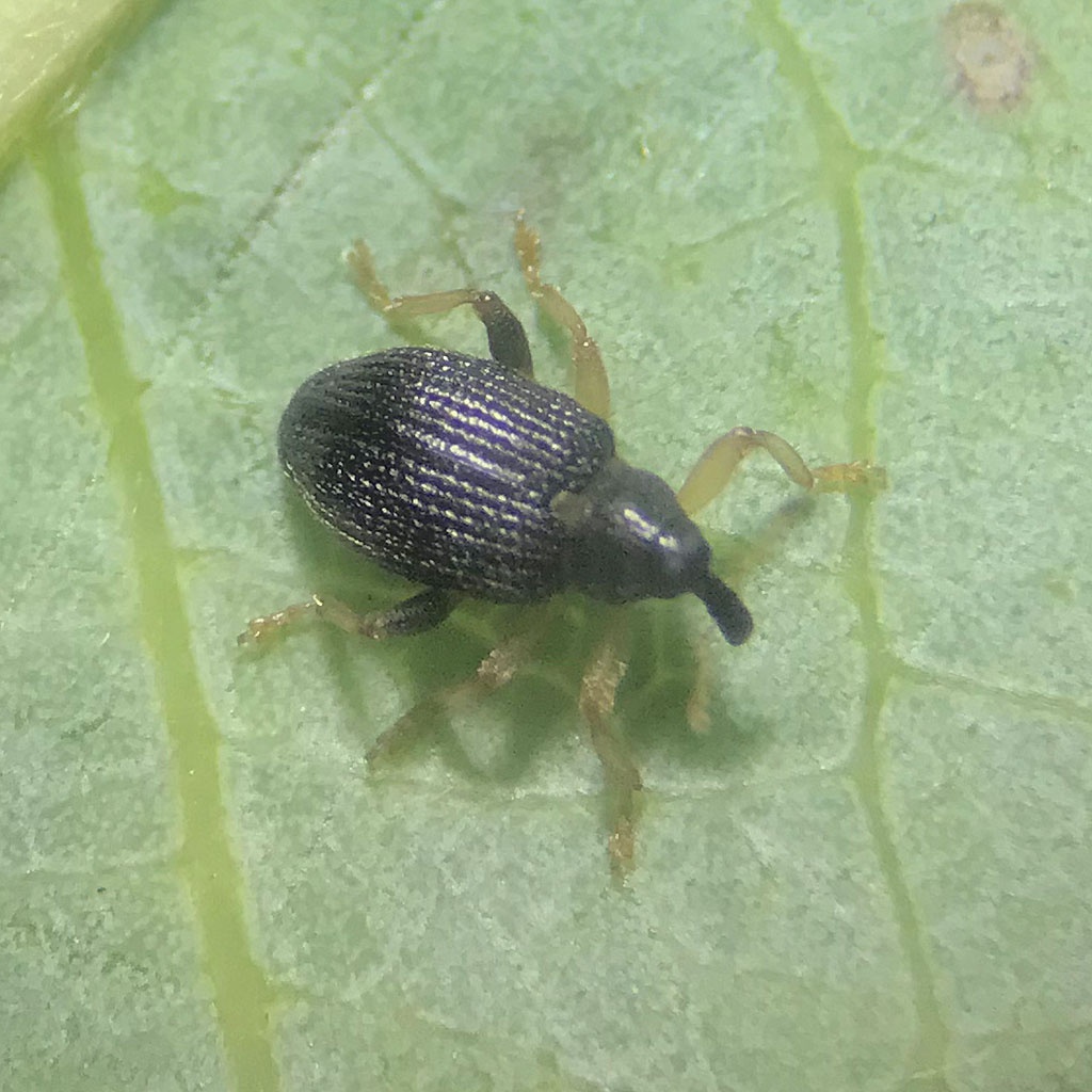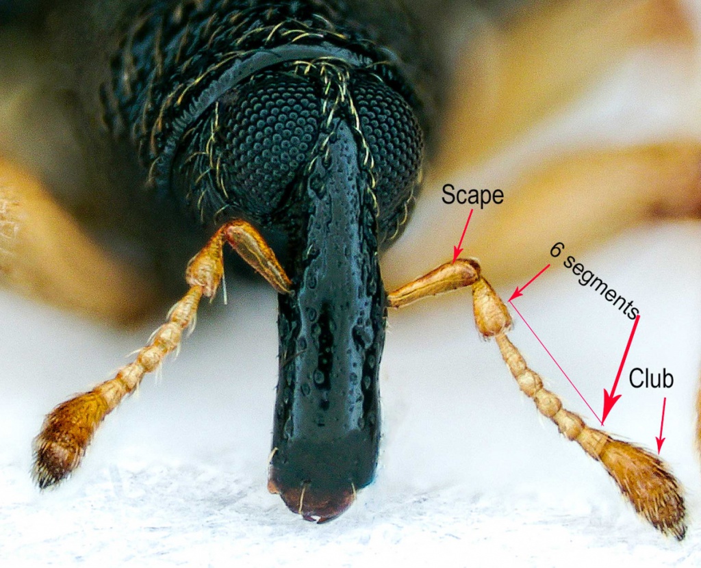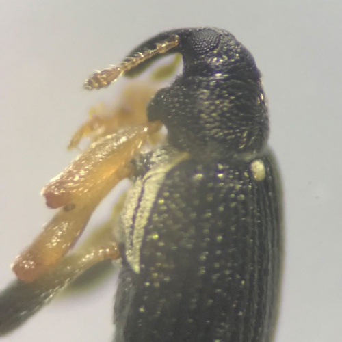 A tiny (2.0-2.5mm) black weevil with a white scutellum, pale tarsi and tibiae and yellow/red fore and mid femora. The antennal funiculus is six-segmented.