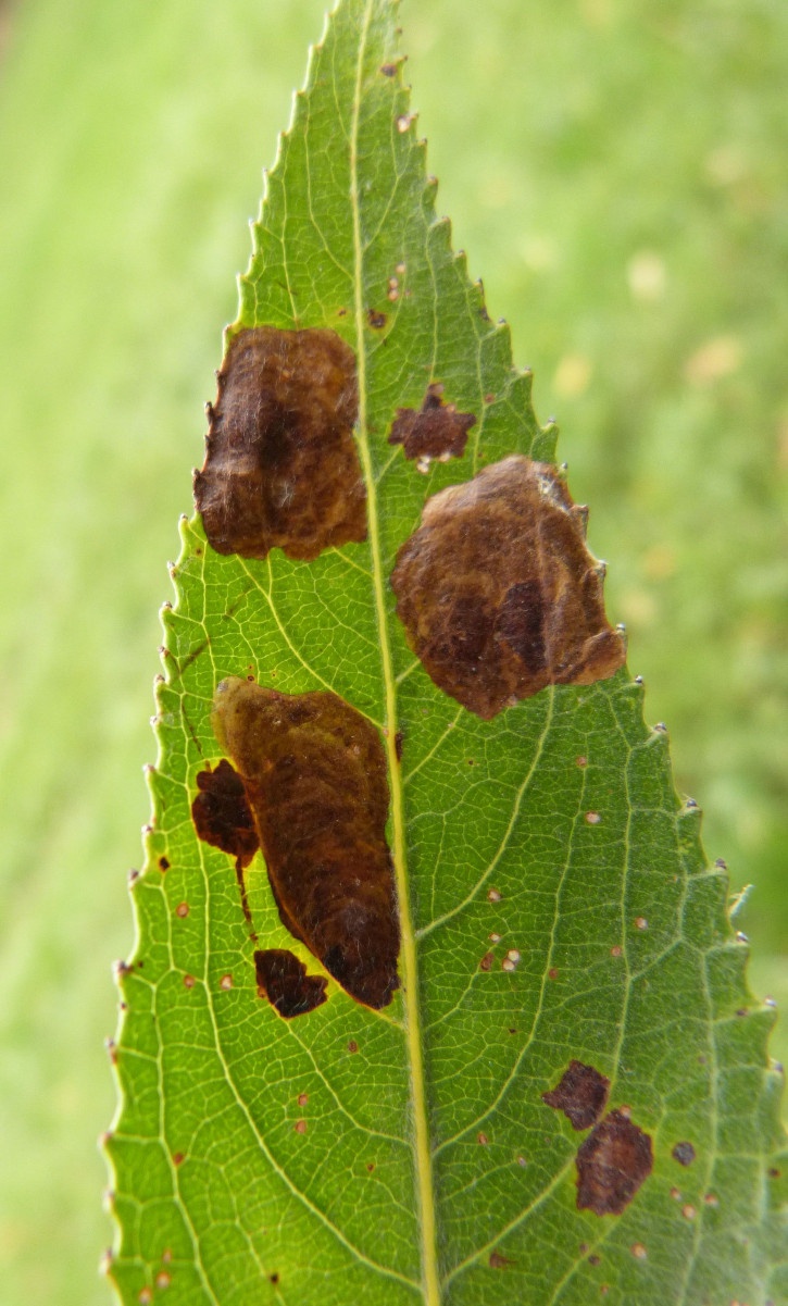 The larvae feed on willow leaves, forming brown blotch mines. The adult must be reared out to identify the mine