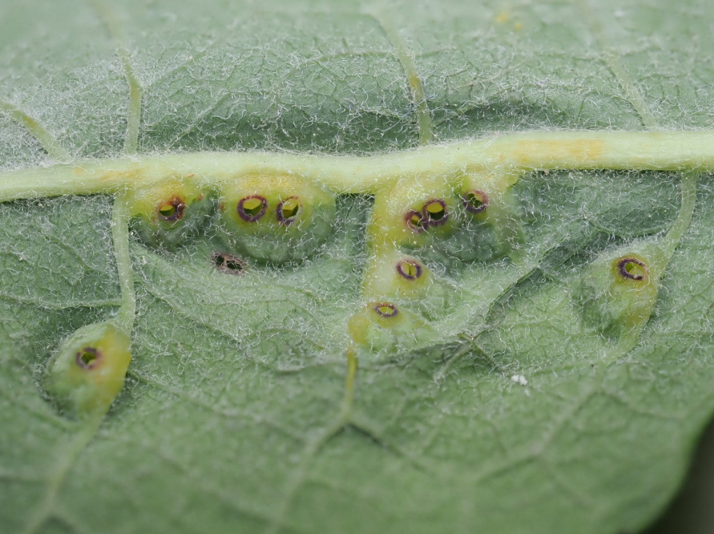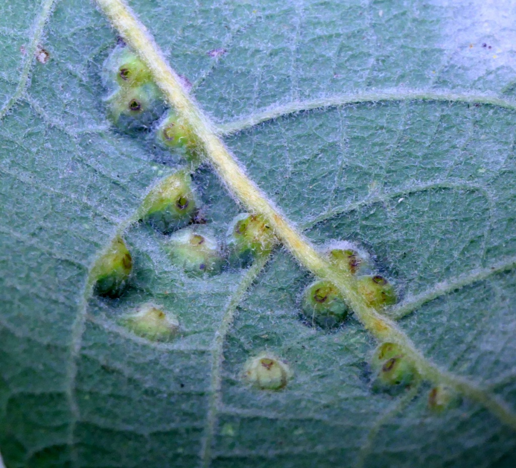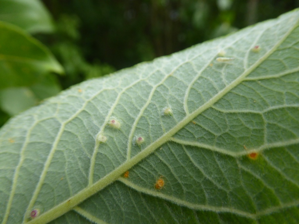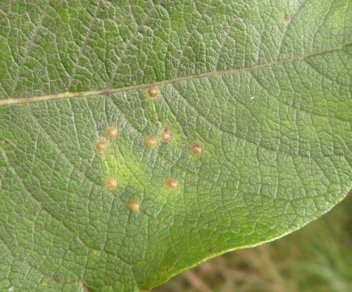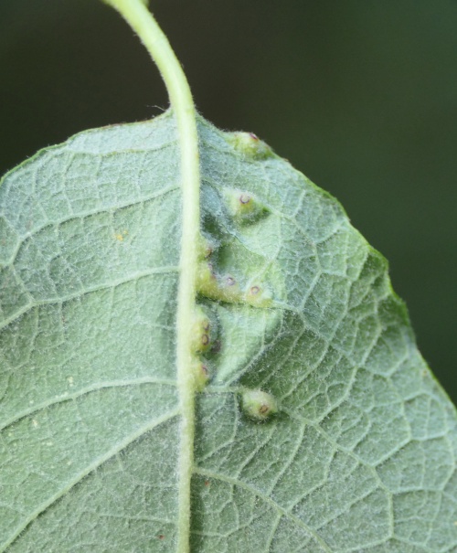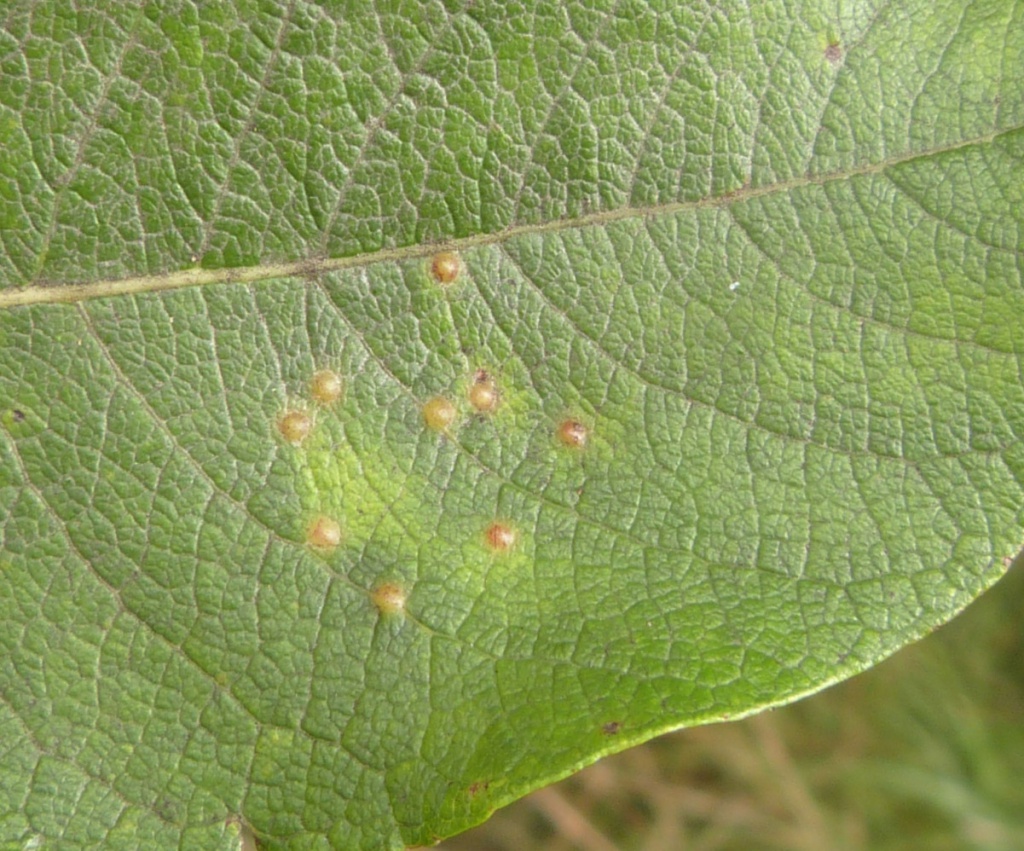 Iteomyia major forms larger galls in coalesced groups associated with the midrib and side veins. Several species or mite and sawfly cause galls on sallows, and are superficially similar.
