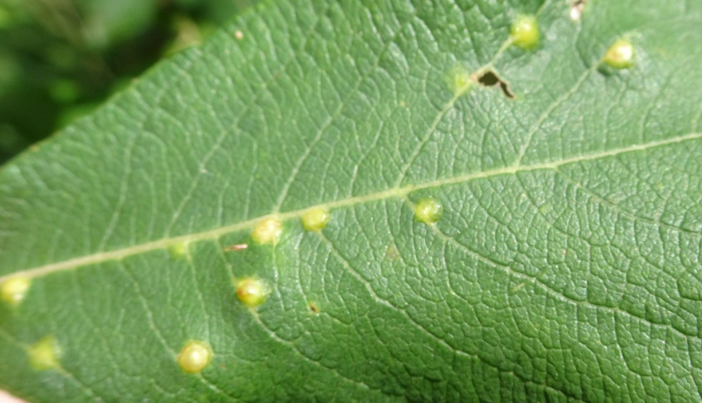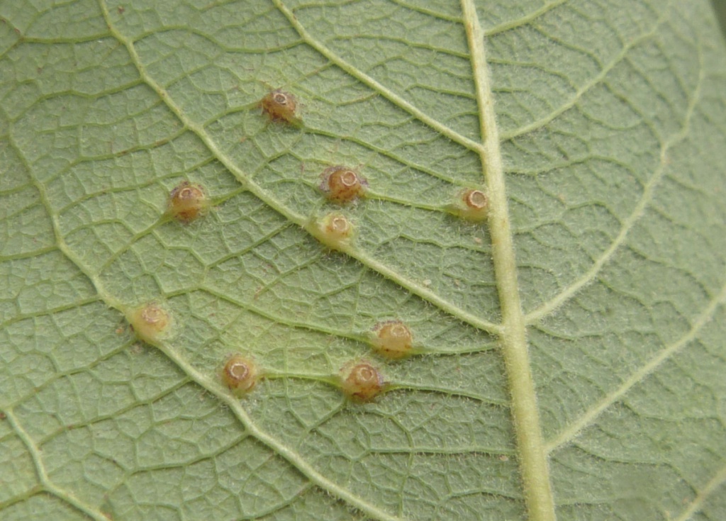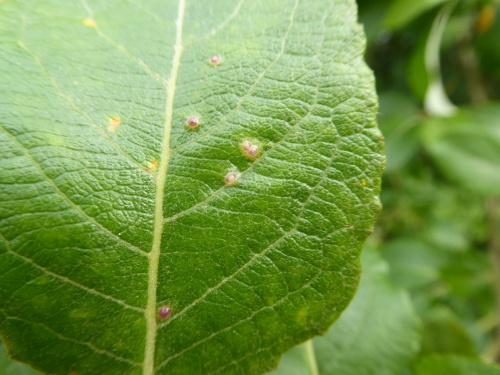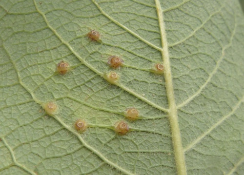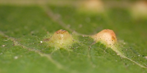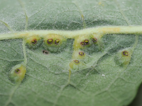 Iteomyia capreae is a gall midge that causes galls to form on the leaves of sallows (Salix). The galls are small, and usually on the leaf surface forming a hard pouch, domed above and conical below, with a circular red-rimmed opening below; greenish, becoming yellow, brown, purple or red without hairs inside. Occasionally the galls are in side vein which become swollen and hard.
