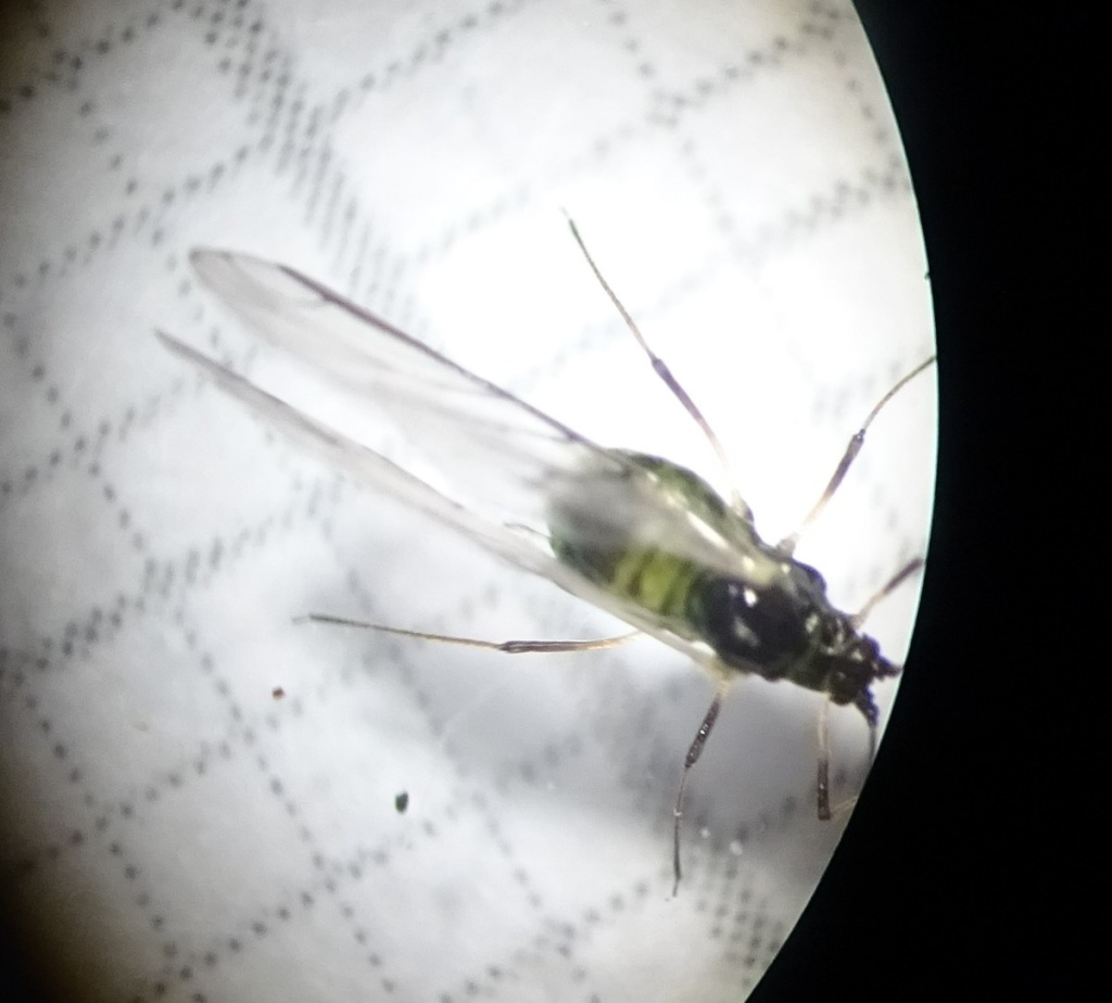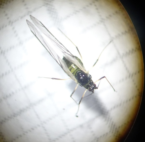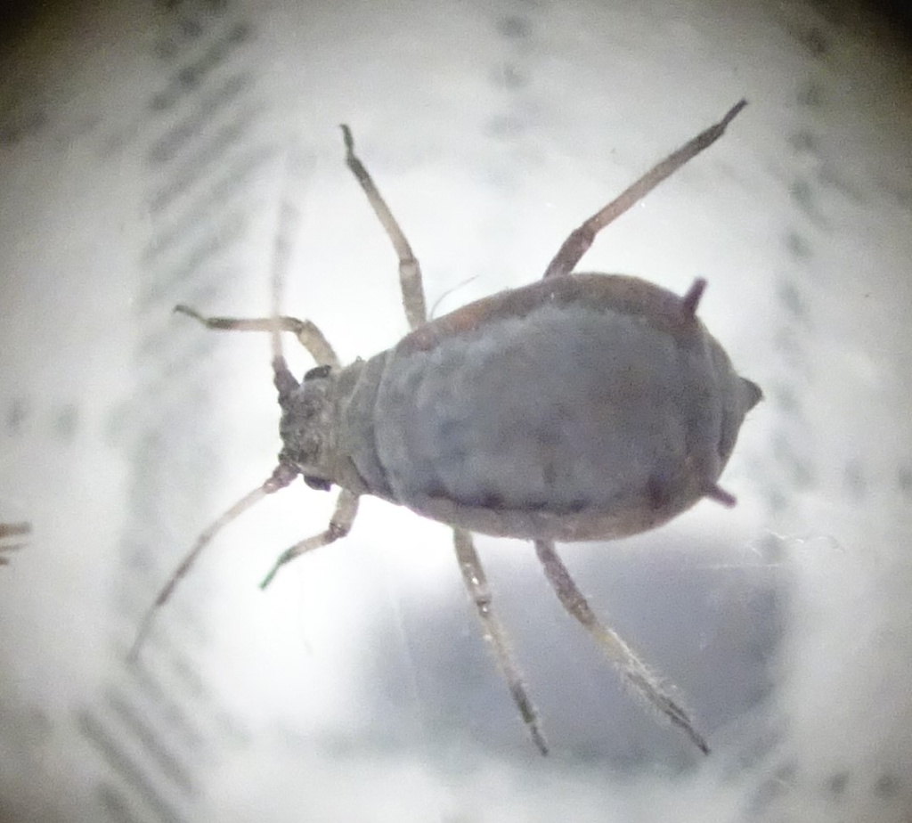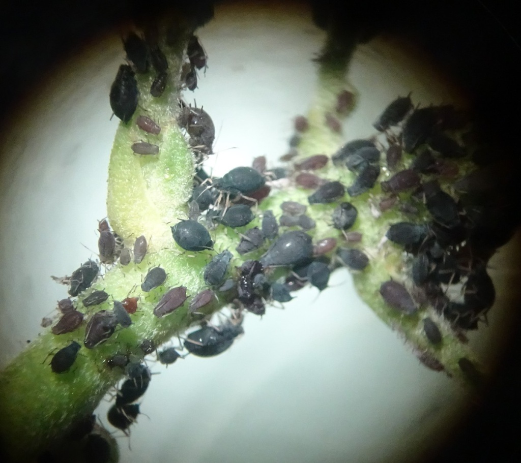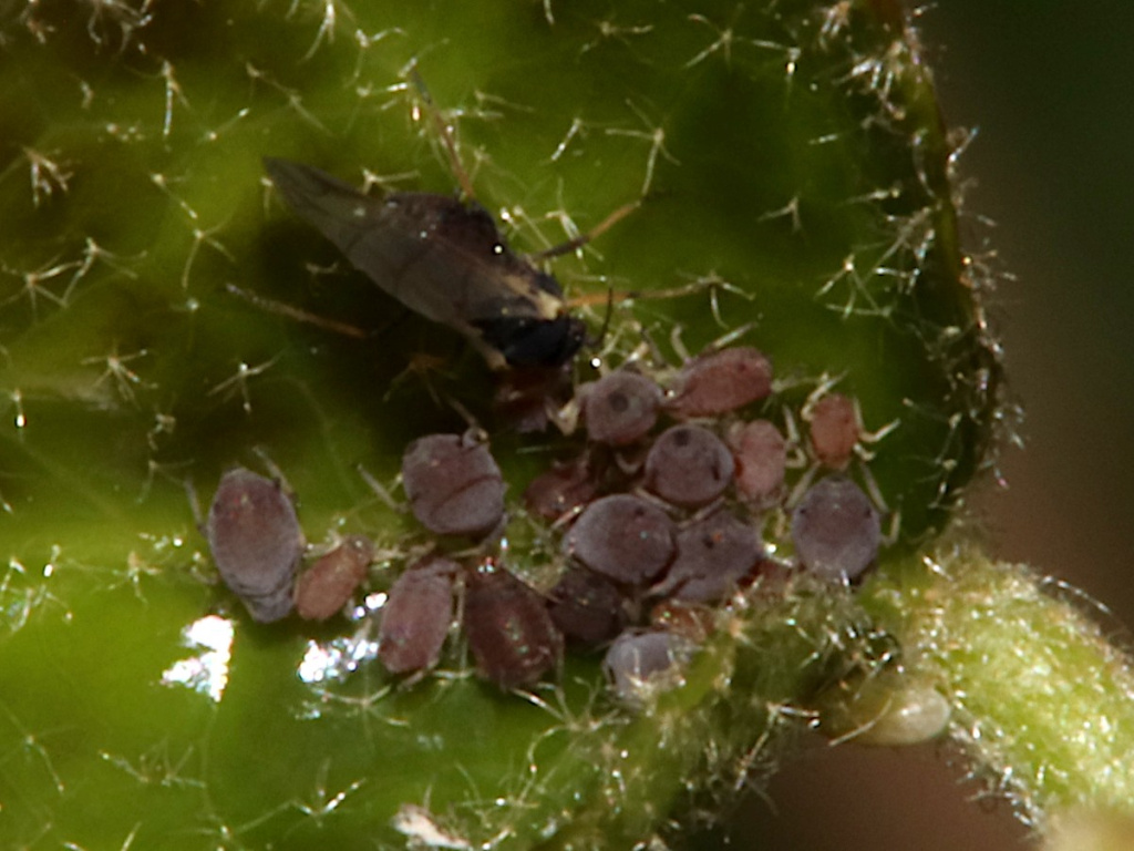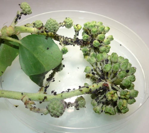 Aphis hederae feeds on Ivy (Hedera helix) living on the young shoots and foliage.