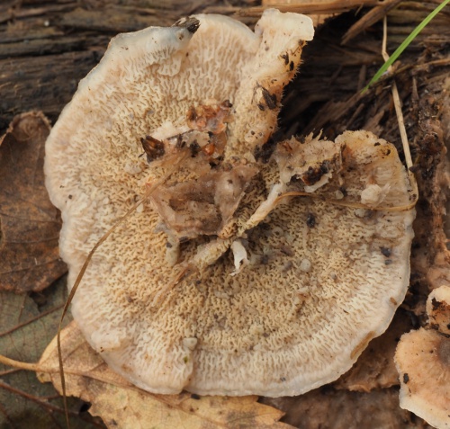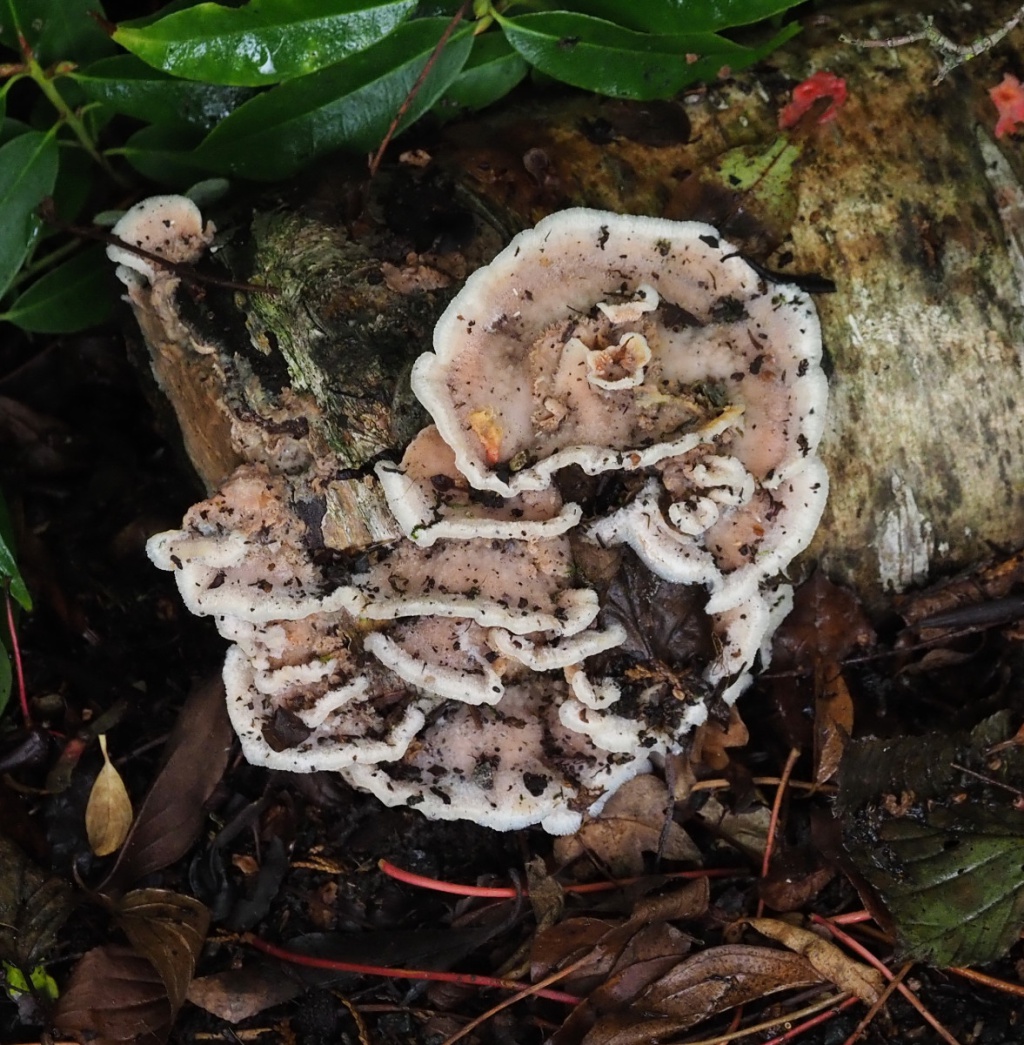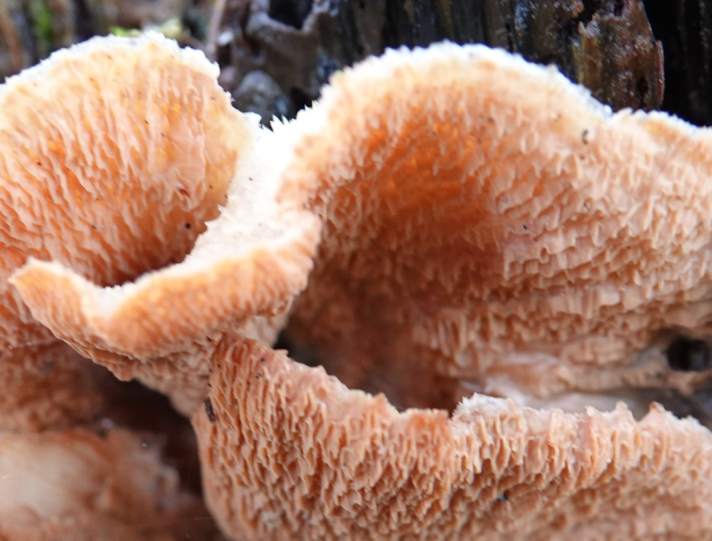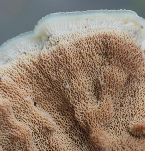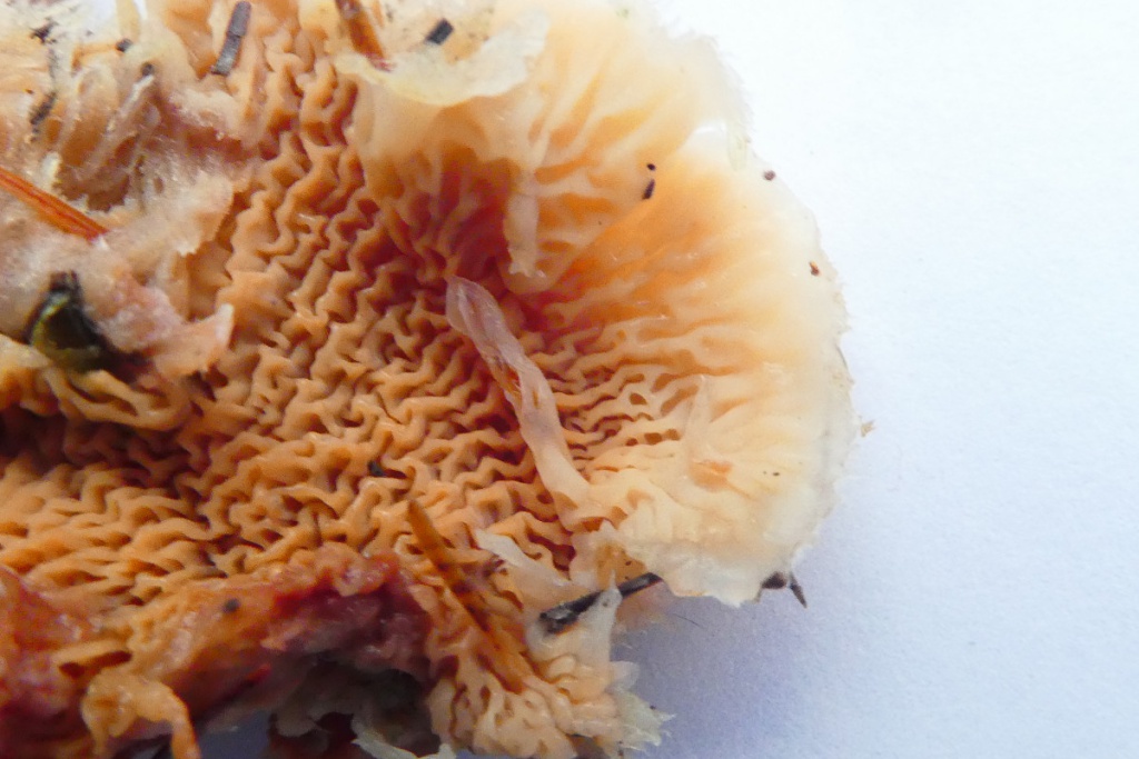 Young specimens are resupinate and white, but then reflex to form bracket-like outgrowths which are orange-pink with a paler edge. The reflexed growths have a hairy upperside. The underside of the reflexed fruit bodies is deeply wrinkled and produces the spores.