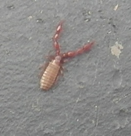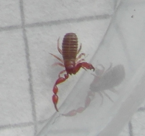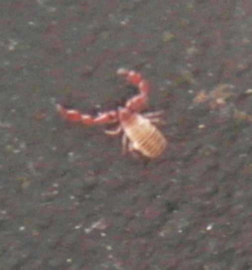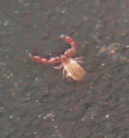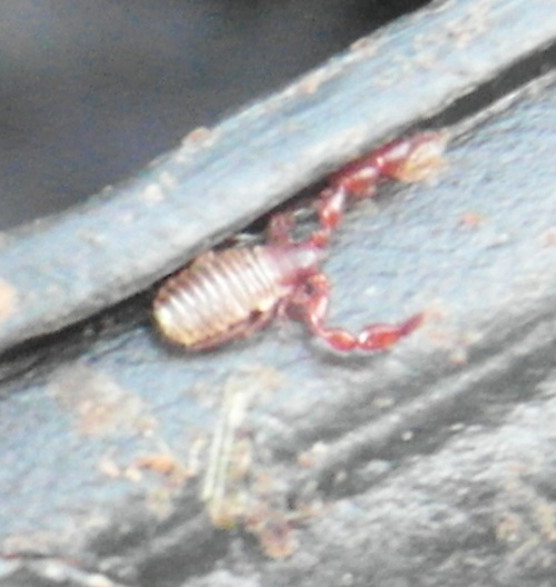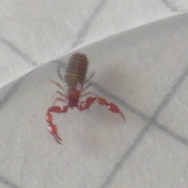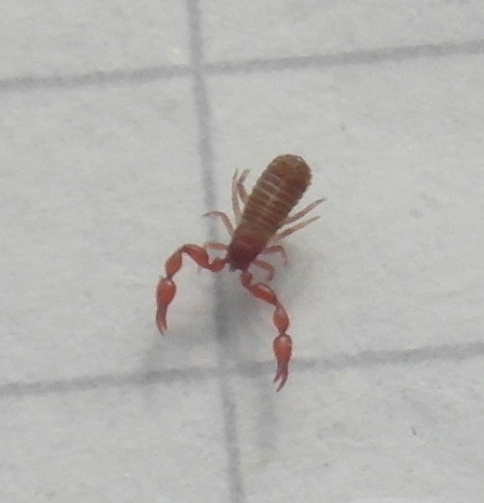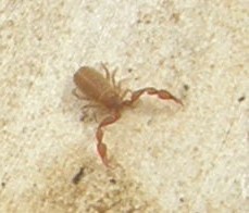 Length of body 1.8 to 2.2 mm. Pseudoscorpions are small arachnids with a flat, pear-shaped body and pincers that resemble those of scorpions. The pincers in this species are reddish brown, the body being yellow/olive in colour and glossy.