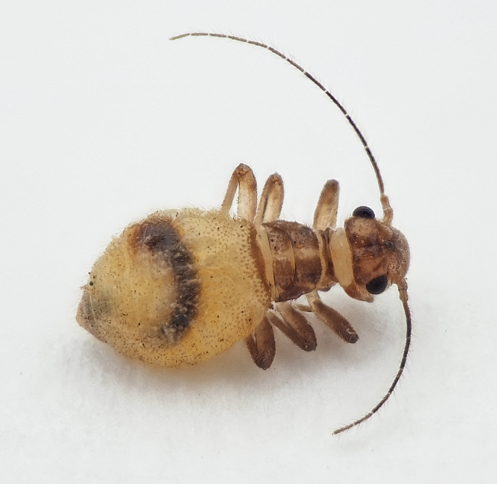 A small barkfly about 3mm in length. Its colouring ranges from yellowish on the underside to dark brown on the head and thorax.