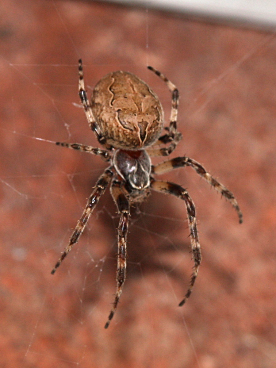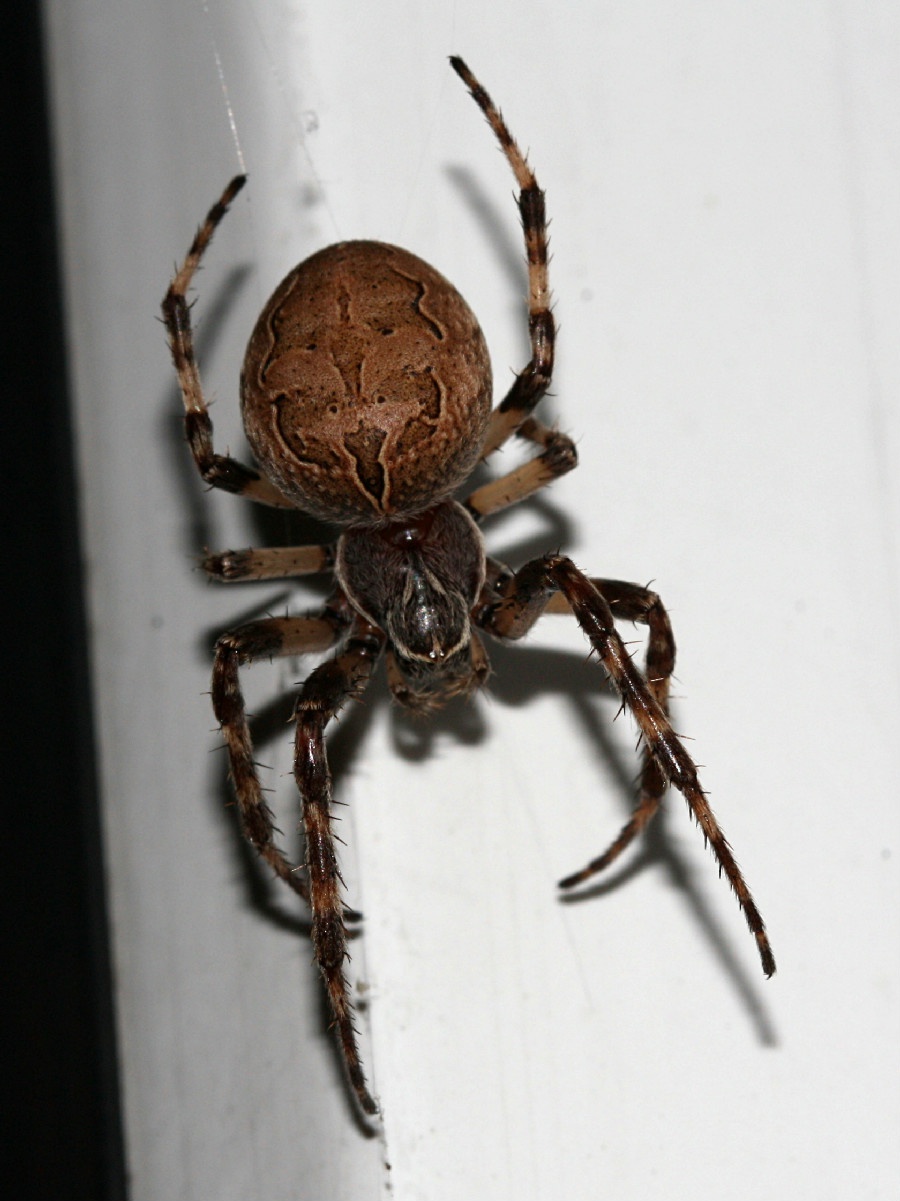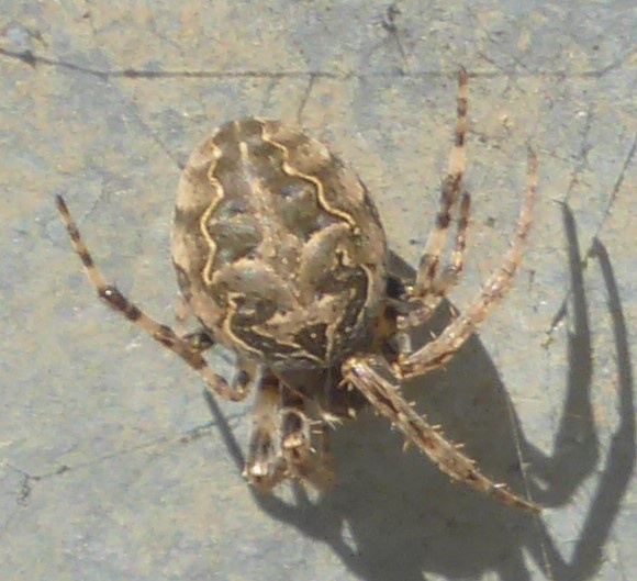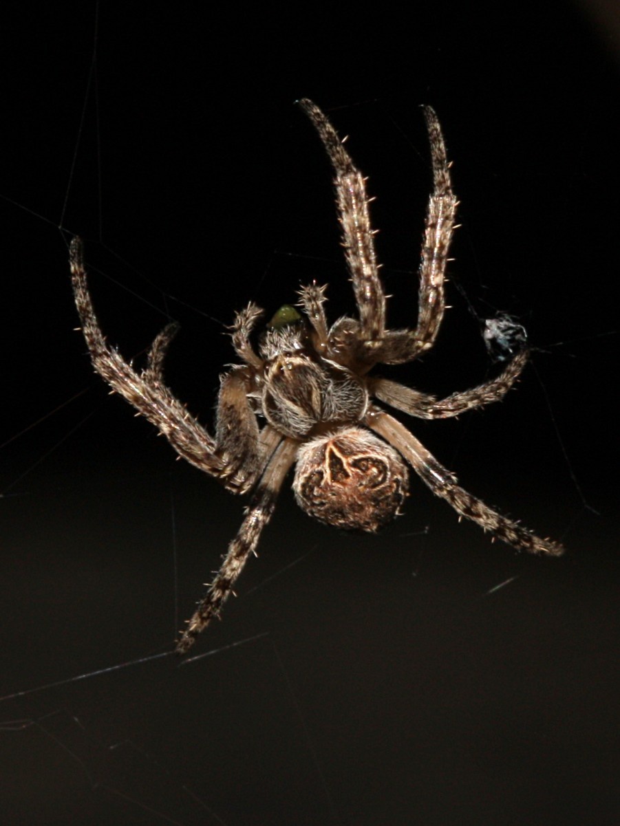 Females reach a body length of about 10 mm, males are somewhat smaller. Generally black and white and sometimes velvet-like in appearance, prosoma (cephalothorax) grey (c.f. Larinioides cornutus - prosoma brown).
