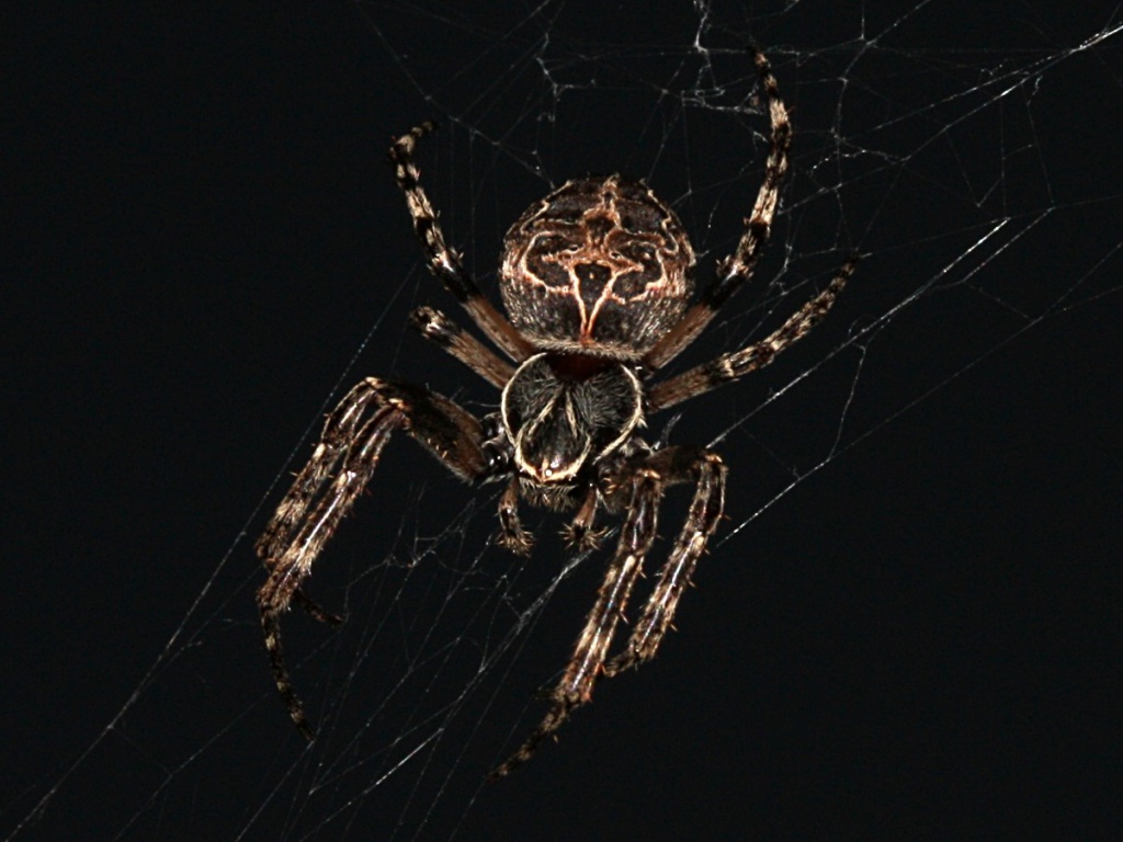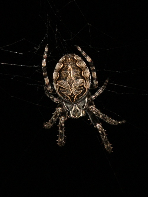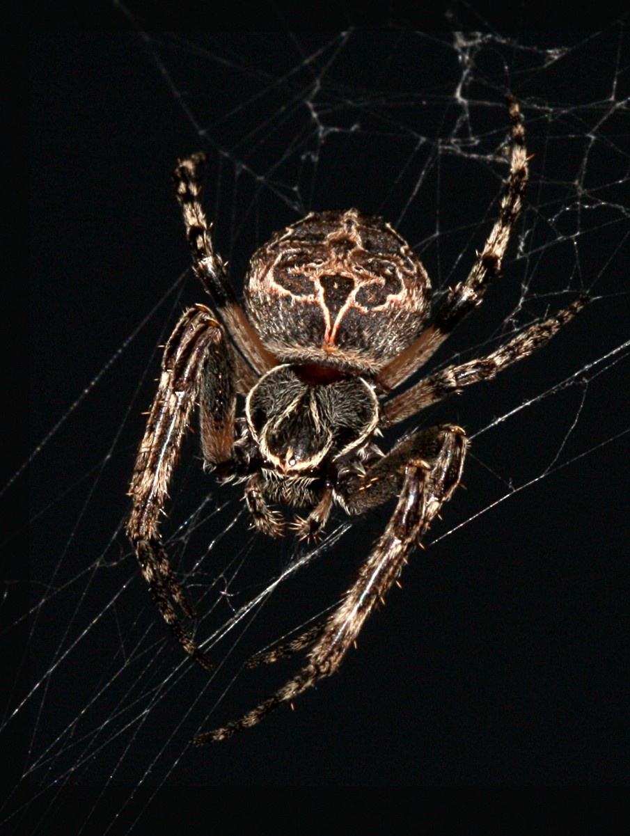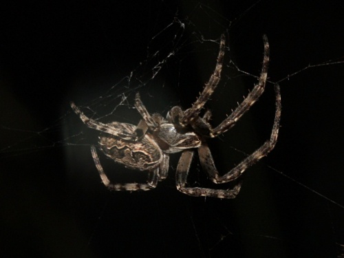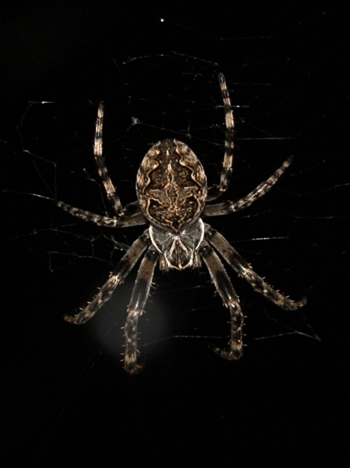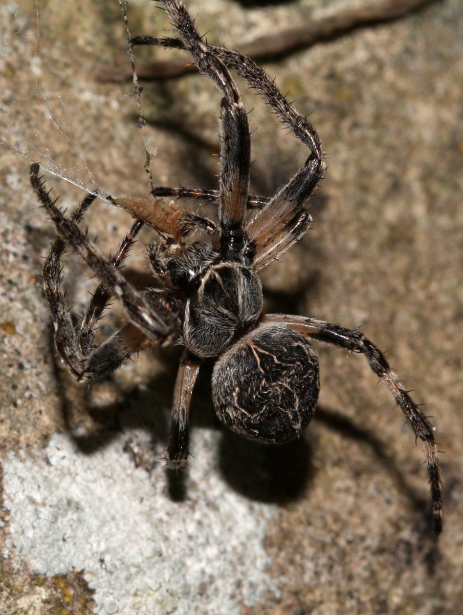 Females reach a body length of about 10 mm, males are somewhat smaller. Generally black and white and sometimes velvet-like in appearance, prosoma (cephalothorax) grey (c.f. Larinioides cornutus - prosoma brown).