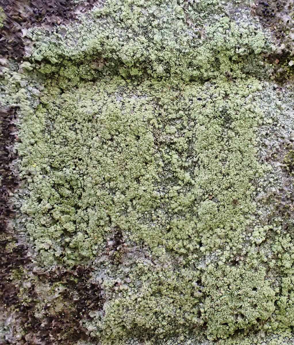 Yellow-green crust found on bark and occasionally on dry acid rock. It reacts orange to C (bleach).