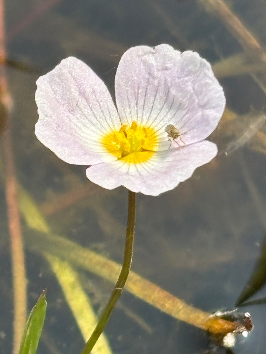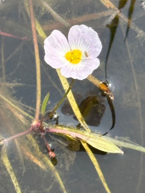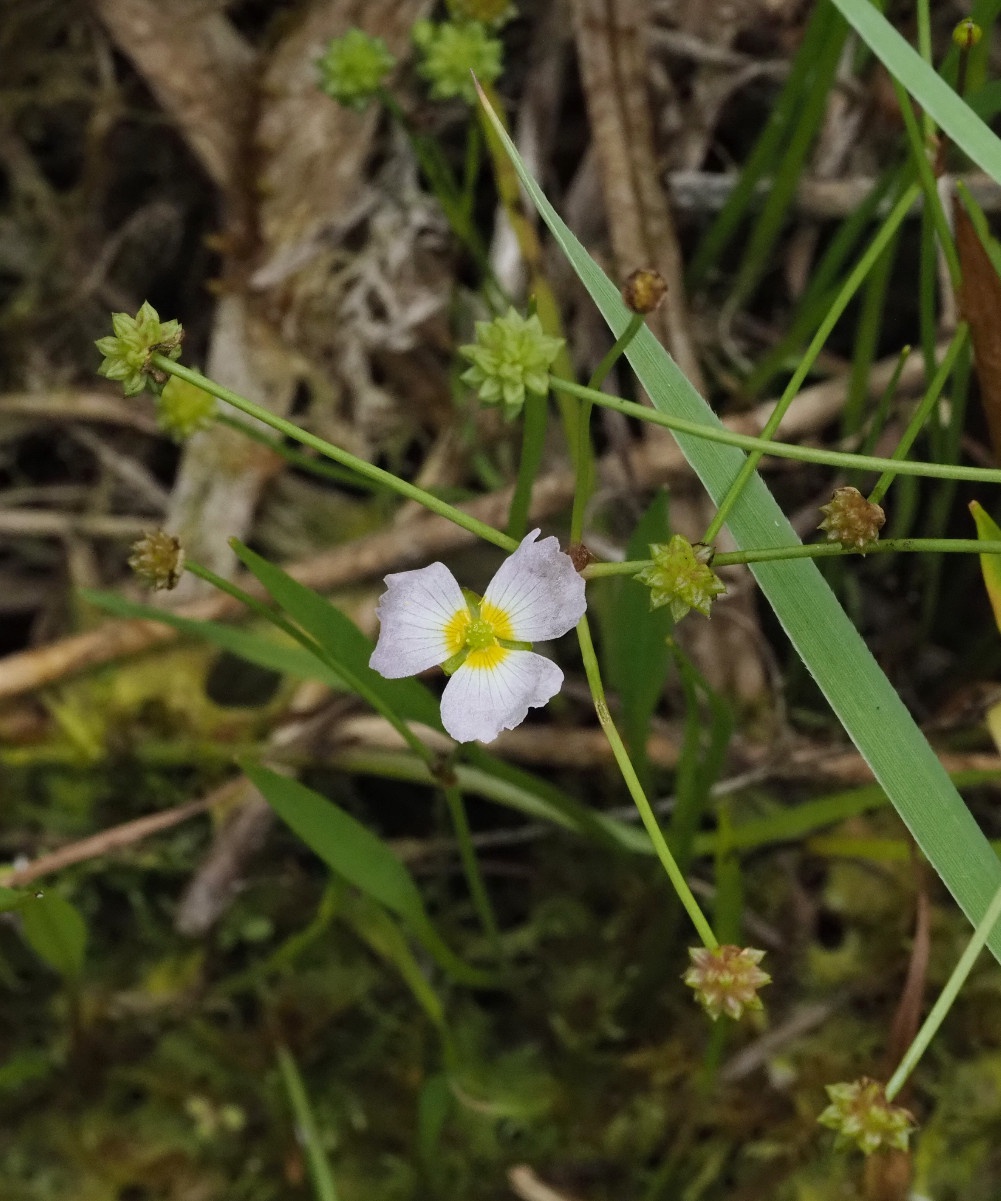 This plant has white flowers, sometimes tinged with pale pink or pale lilac. Each flower has three dainty petals with rough, ragged edges and fairly short sepals. Flowers are typically 12 to 16 mm across. The seeds are rather like those of buttercups. Leaves are in a basal rosette, lanceolate, tapered at both ends and stalked.