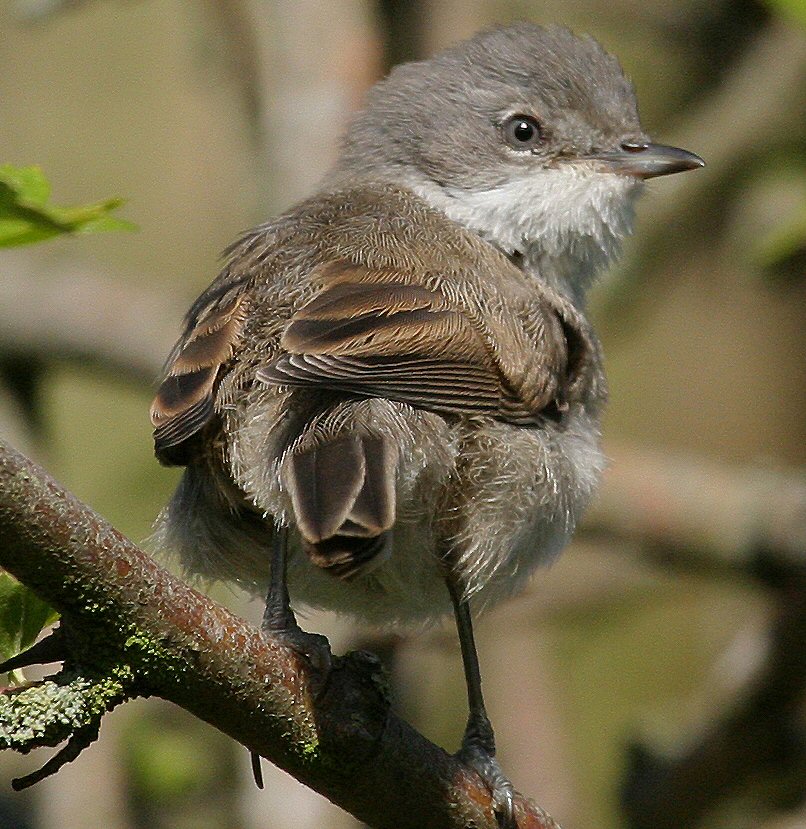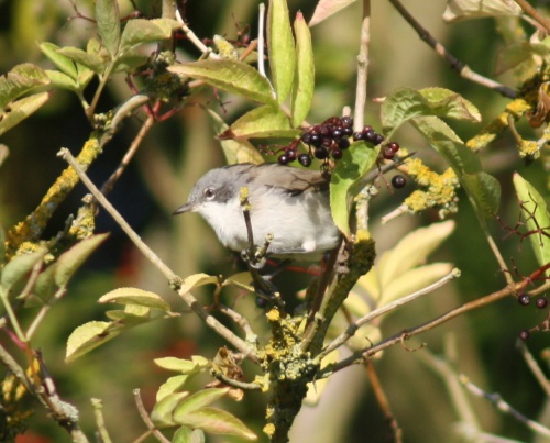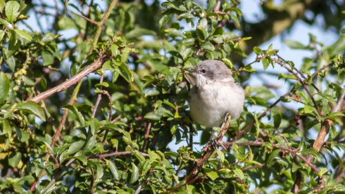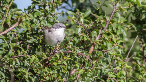 Slightly smaller than the similar Whitethroat, the dark cheek feathers contrast with the white throat and give it a 'masked' look. Overall a much greyer bird and lacks the rufous wings of Whitethroat. It is quite skulking and often only noticed when its gives its rattling song or 'tacking' call. When its flits from cover it shows white outer tail feathers (as does Whitethroat).