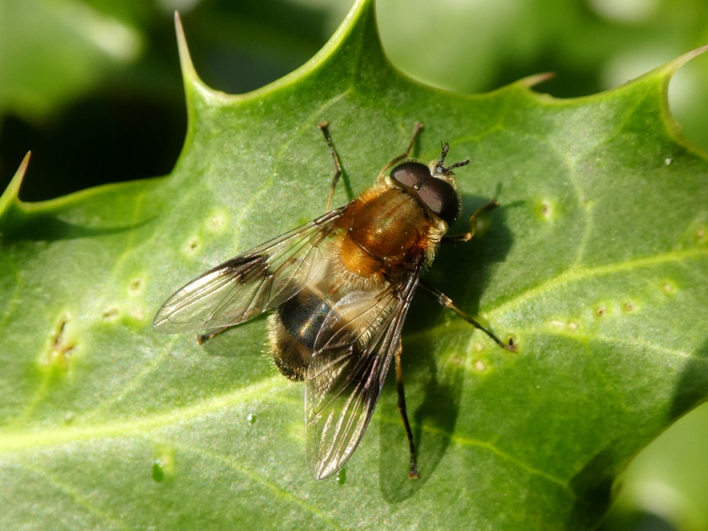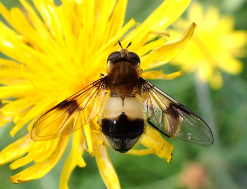 A striking hoverfly with a white band across the upper abdomen and black wing patches that align with the black abdominal band. In the male, the white band on tergite 2 can often be darker. Both sexes have an obvious yellow-orange scutellum that immediately distinguishes this species from Volucella pellucens, the only other similar hoverfly.