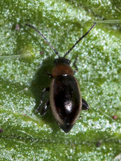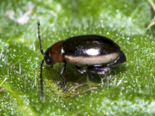 This small beetle (2 to 3 mm) has a black head and an brown pronotum. The dark elytra have broad yellow margins.