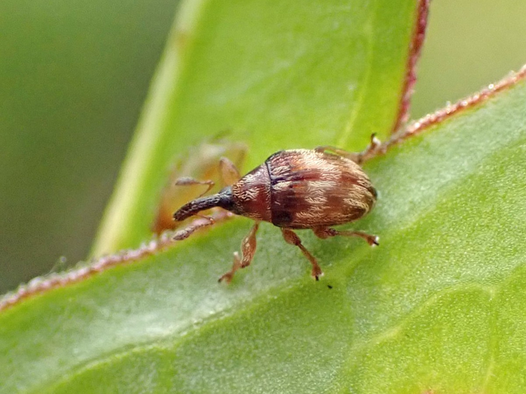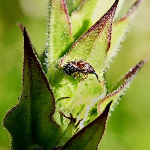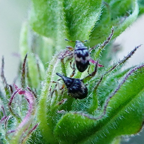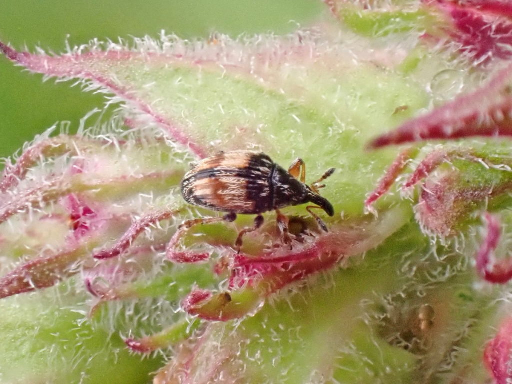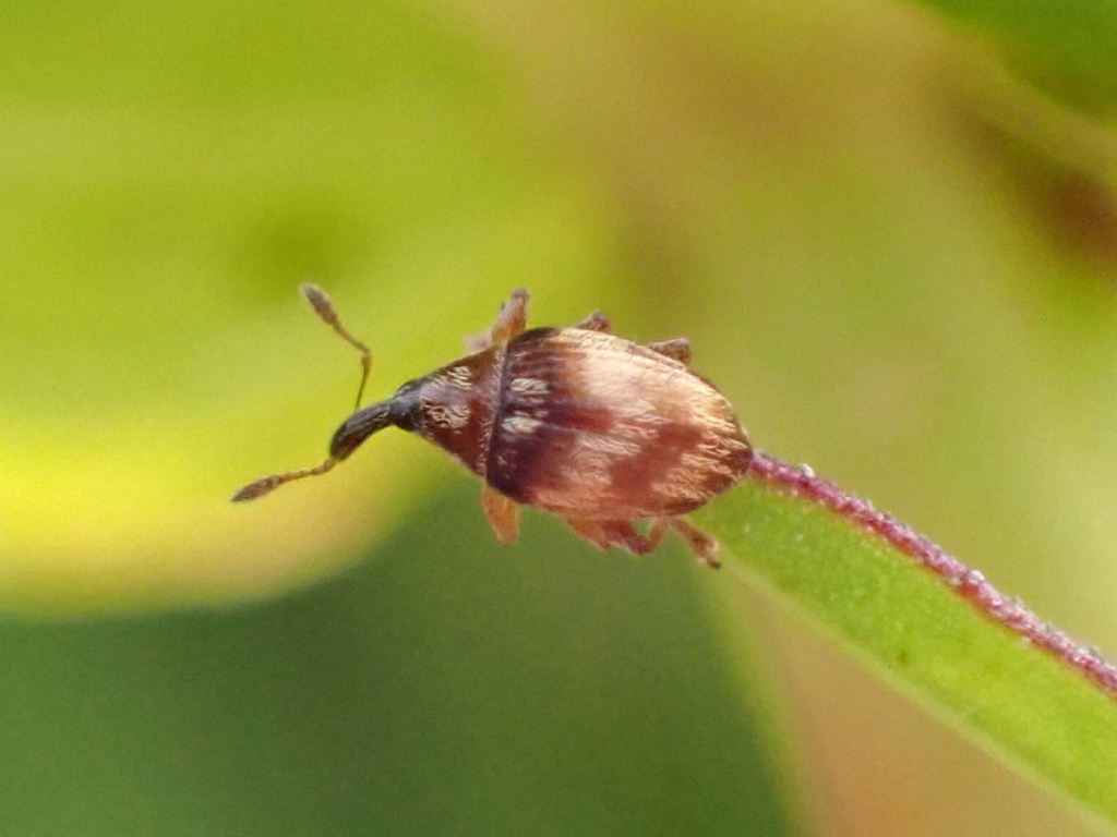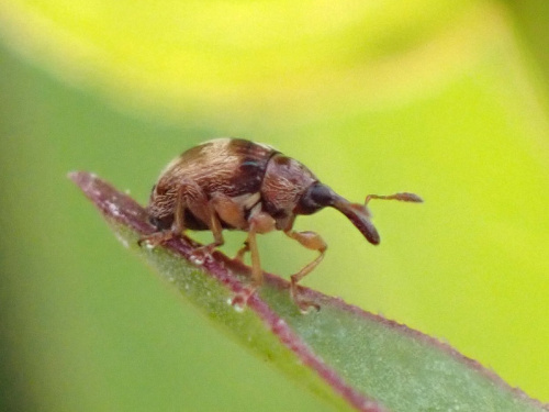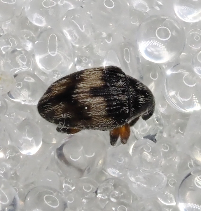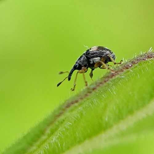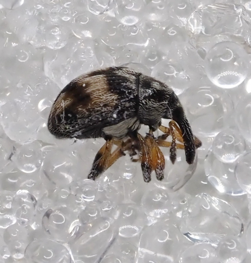 A tiny weevil 1.5 to 2.5 mm. Body black with variable yellow or cream marking to the elytra; these vary in intensity and size and specimens may be entirely pale over the apical two-thirds or, conversely, entirely black.