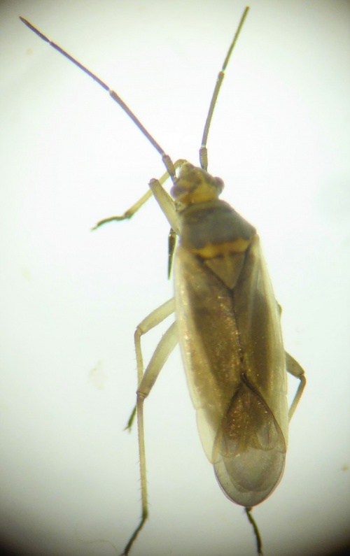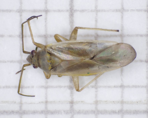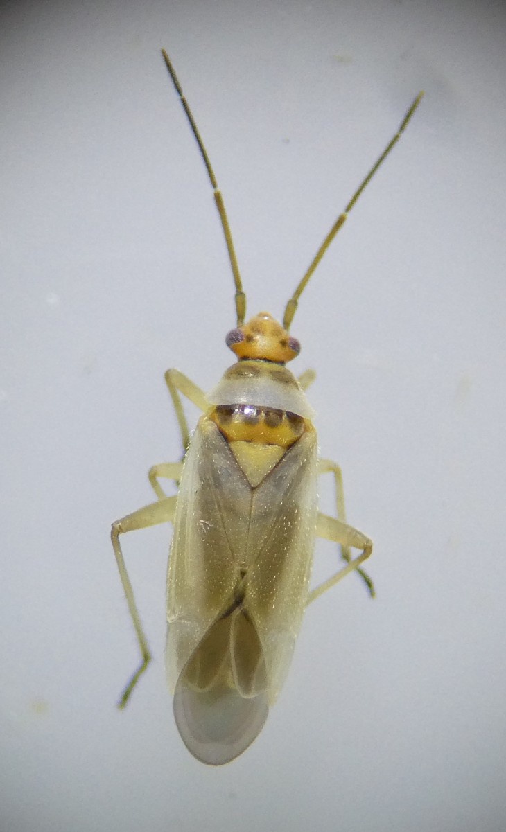 Length 4 to 5 mm. A fairly small greyish-yellow bug which is elongate oval in shape. The head has two darker marks bordering the eyes and the tarsi are entirely dark. There are other, very similar species and care is needed with identification.