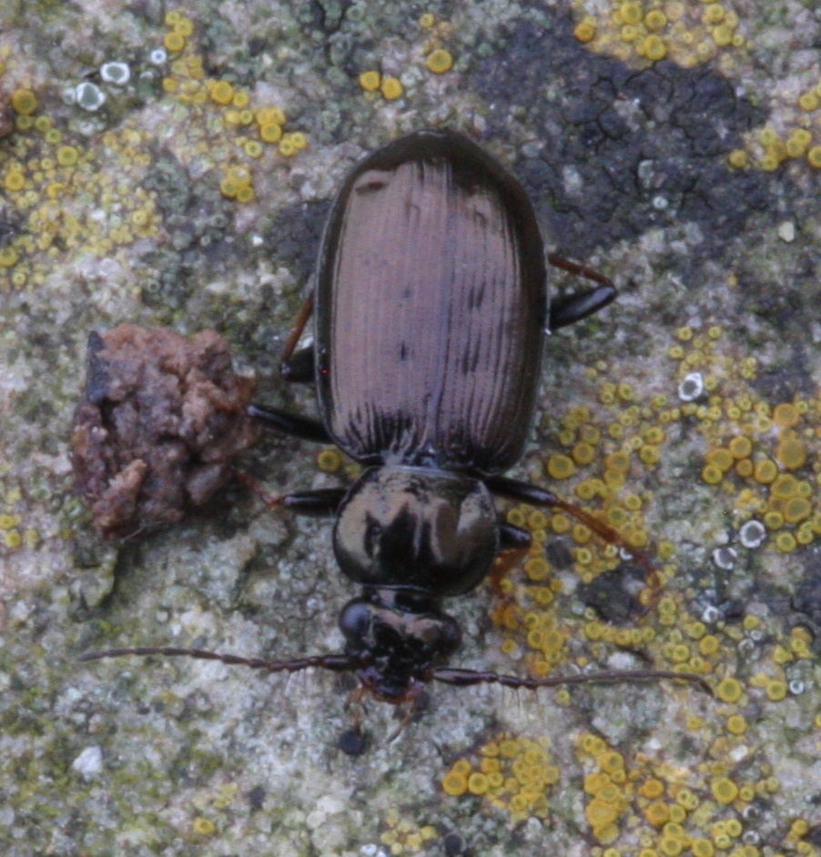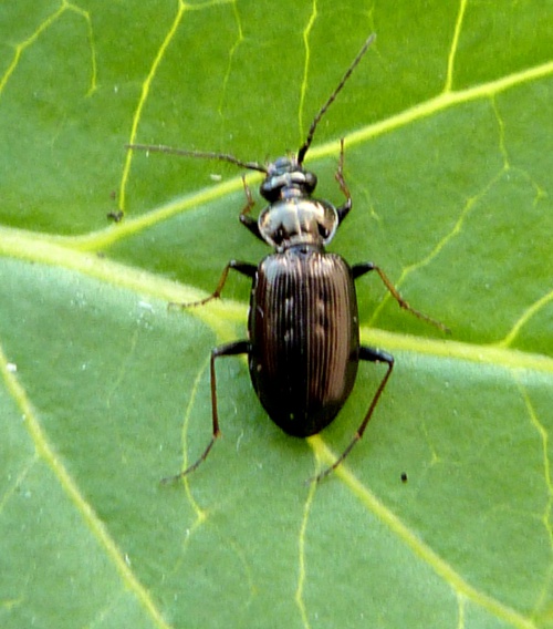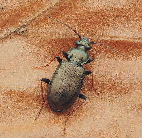 A small (6 to 8.5 mm) brassy-brown or bronze-black ground beetle, this species has cup like depressions (foveate punctures) on the wing cases with conspicuous long bristles (setae) at the bases to its antennae as well as bristles on the underside of its head. It is the only ground beetle with these long setae on the antennae.