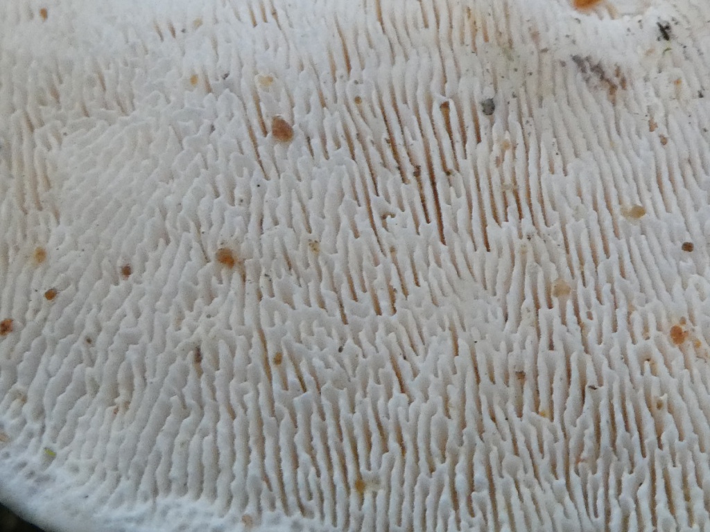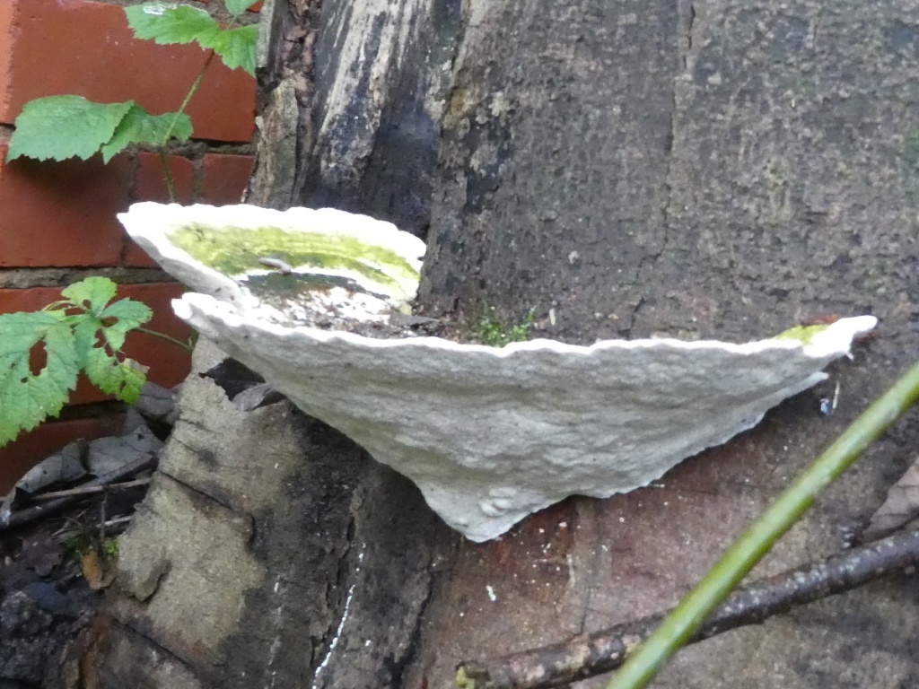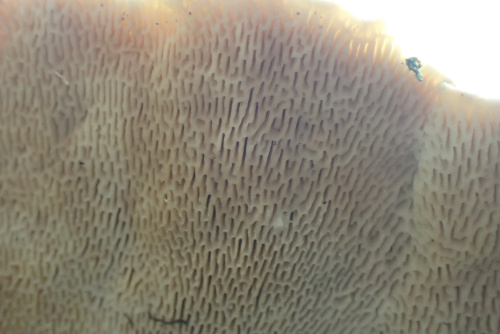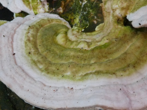 An annual or biennial bracket with thick, tough and rigid, almost smooth caps, scarcely zonate. It typically acquires a green layer of algae. The pores are radially stretched, elongate, up to 5mm long and 1-2mm across.