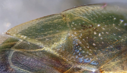 Pubescence on middle of corium sparse; lateral spacing of the hairs generally greater than hair length. Punctures on middle of corium widely spaced, separated by much more than their diameter.