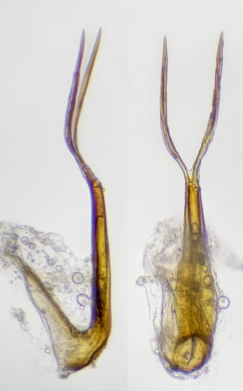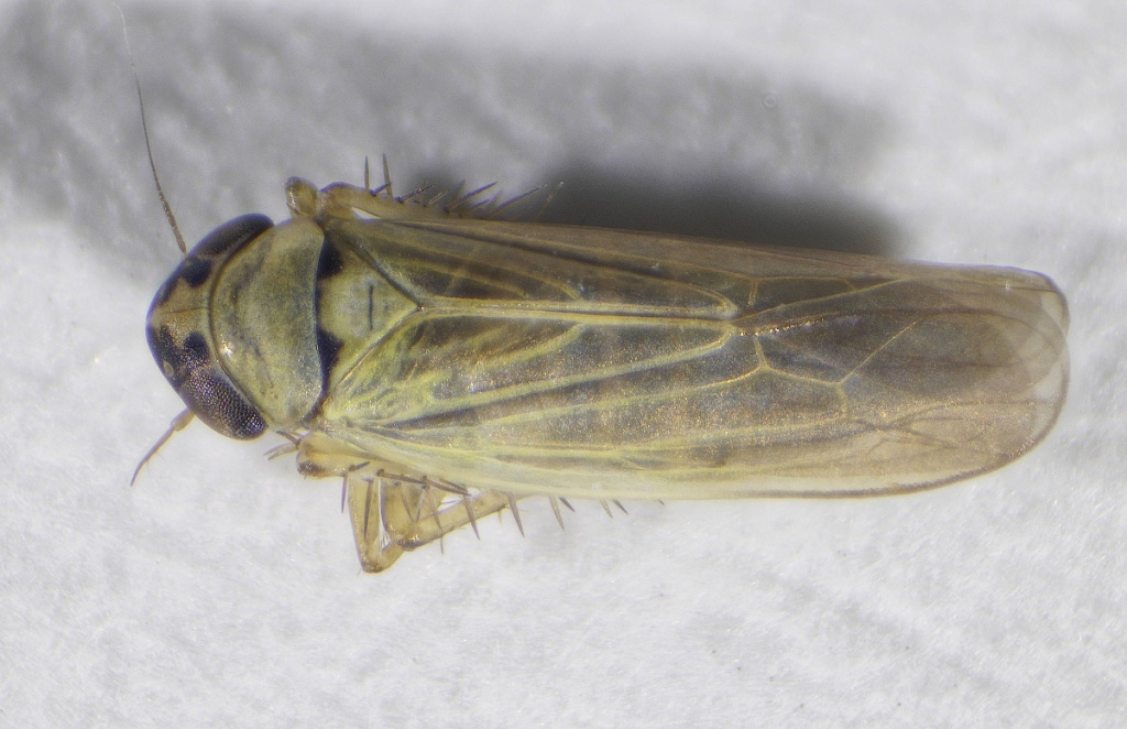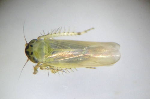 Length 2.9-3.8mm. Macrosteles is an extremely difficult and diverse genus. The vertex has several dark spots or bars and the frons has dark markings; both features are variable. The forewings are greyish or green-yellow, often with brown longitudinal streaks, patches or stripes, but colour and amount of the darker markings varies. Dissection of the male to examine the internal genitalia - the aedeagus - or the internal abdominal structure - sternal apodemes - is needed to identify.
