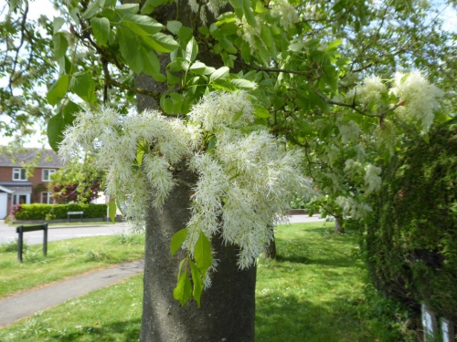 Similar in general appearance to F. excelsior but with brown hairy buds and sprays of creamy white flowers.