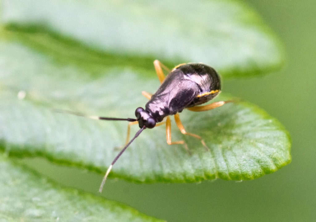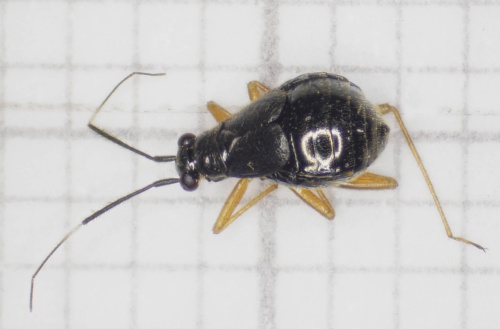 Length 2.5 to 4.5 mm. Mecomma species are sexually dimorphic; males are macropterous and females usually brachypterous. Male M. ambulans are separated from the more local M. dispar by the entirely dark antennae and by the pronotum, which is clearly wider than the head. Females have all dark forewings, the 1st antennal segment is dark and the 2nd segment is not clubbed. The dark head readily distinguishes this sex from Orthonotus rufifrons.
