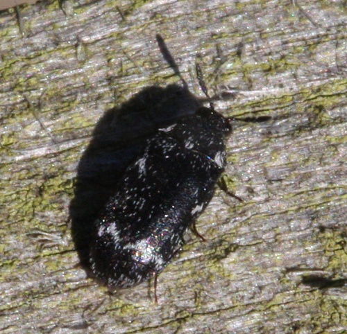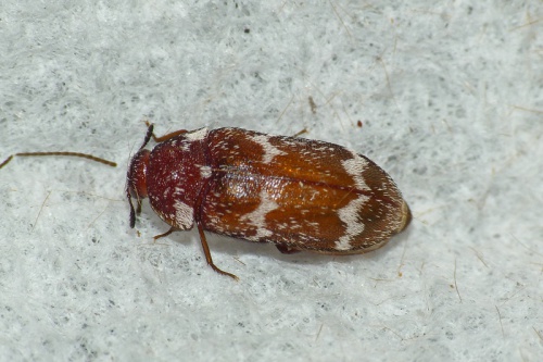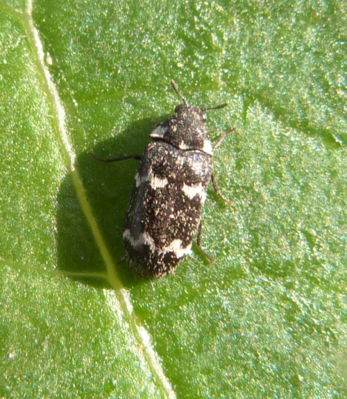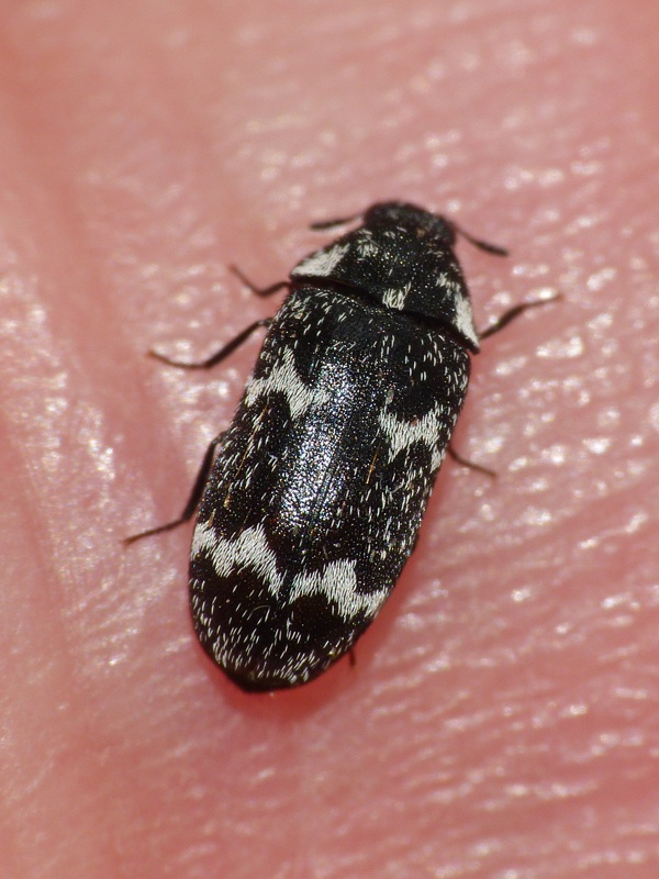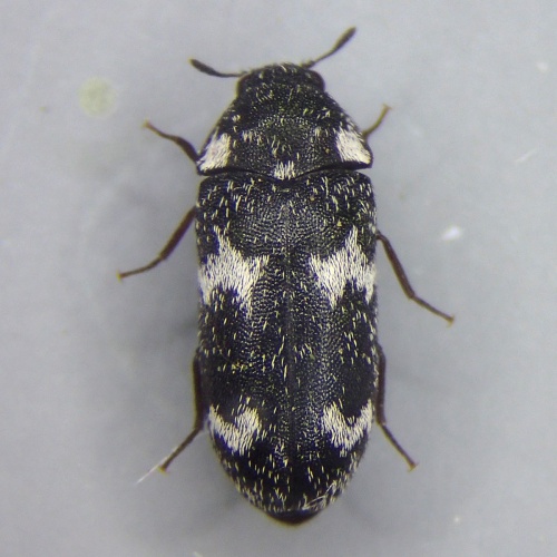 4 to 6 mm. Black with distinctive white markings on the pronotum and elytra. Freshly emerged specimens are initially brown.
