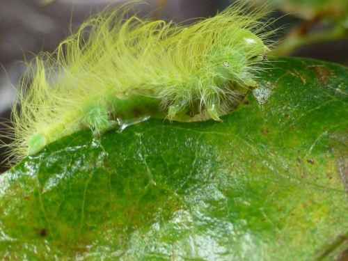 The highly distinctive caterpillar is pale green and is covered with extremely long whitish hairs, giving the whole larva a feather-like appearance. It feeds mainly on Birch but also on other deciduous trees.