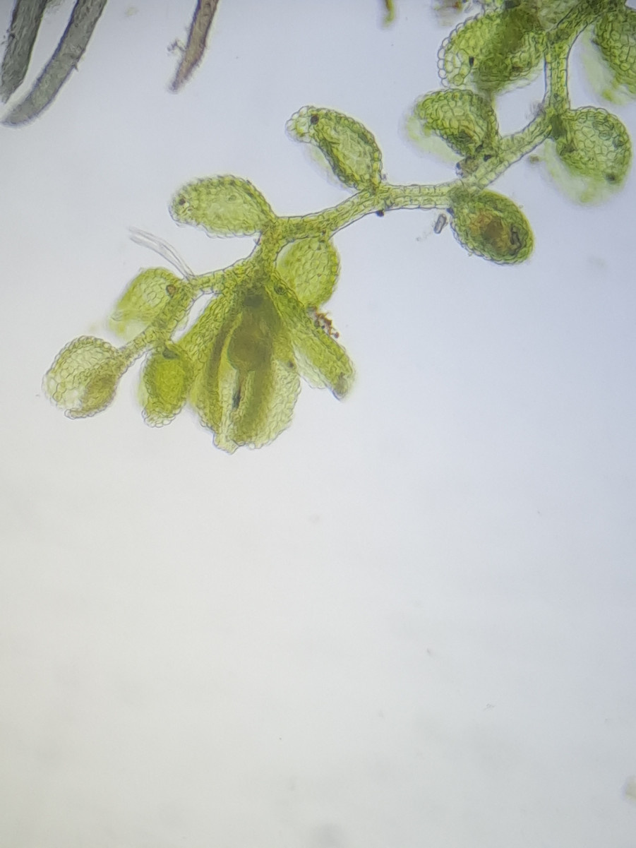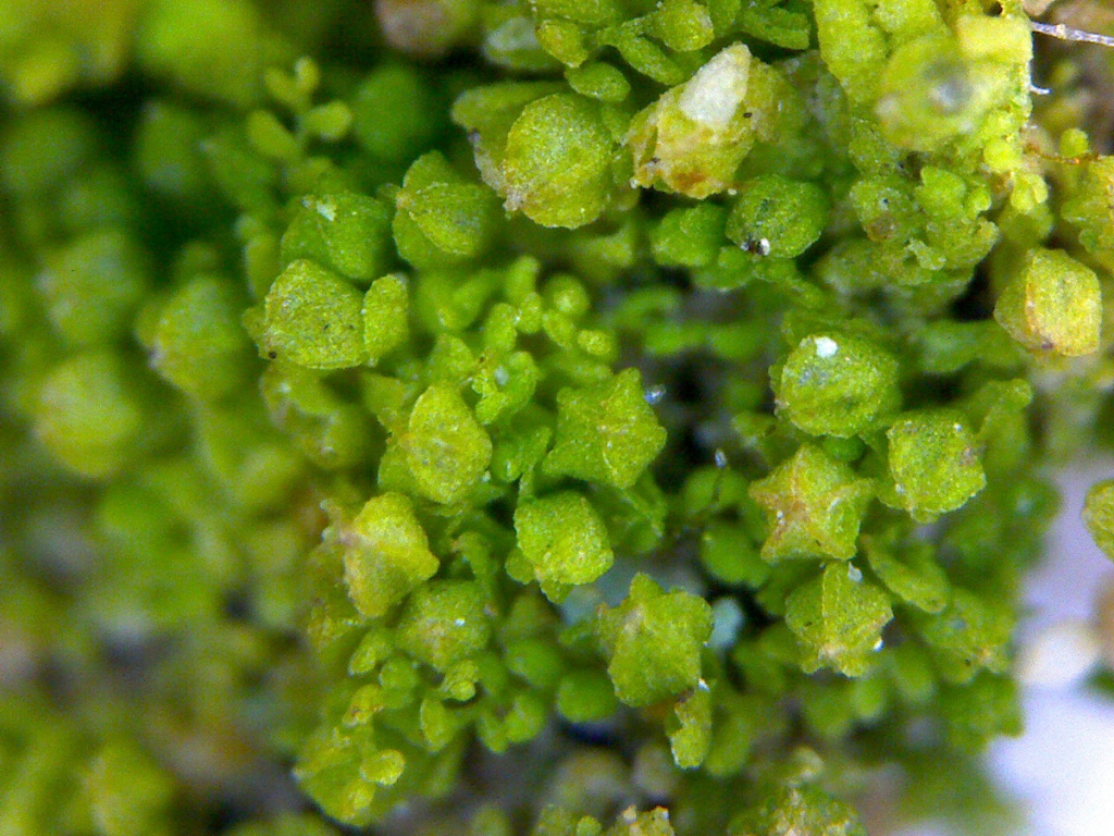 The perianths of C. minutissima, which look like 5-pointed stars emerging from dense patches of slender (up to 4 mm long and 0.5 mm wide) shoots are the most striking character of this pale green leafy liverwort. The leaves are minute (up to 0.25 mm long) and rounded, with a lobule almost as big as the lobe. There are no underleaves. Individual shoots look like a string of beads.