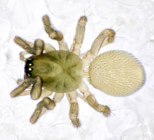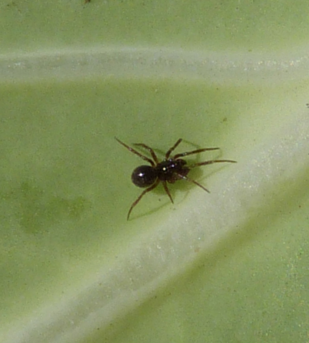 This is a very small (2 mm) spider. The colouring is variable, but the abdomen is usually brown or black.