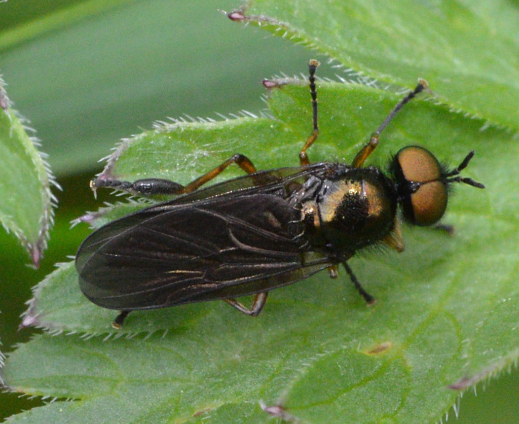 This genus of soldierflies are all of modest size with an elliptical abdomen. The abdomen is either blackish or mainly orange but without a striking pattern. They also have 6 spines projecting backwards from the scutellum. Note that flies in the related Chorisops genus have 4 spines.