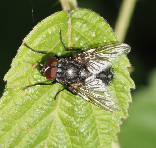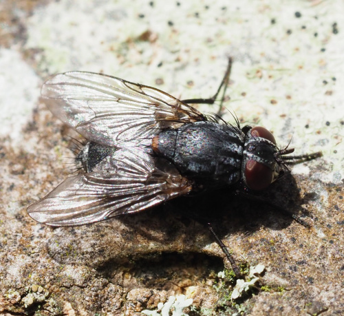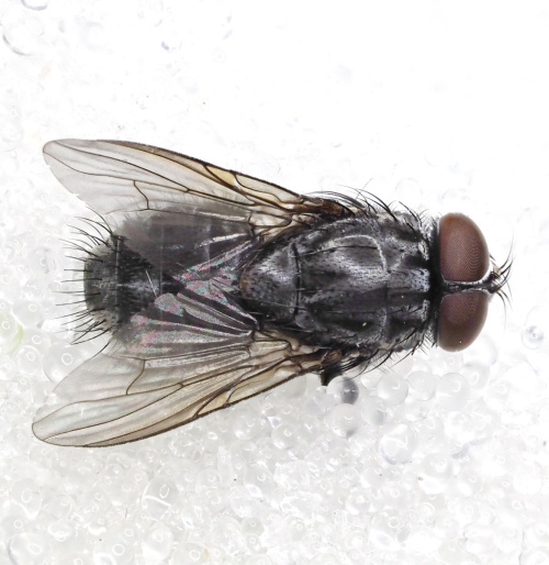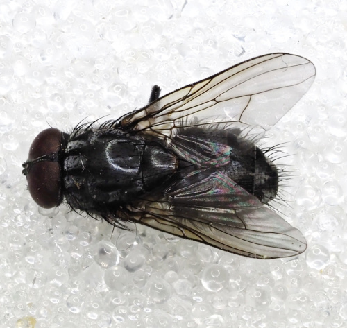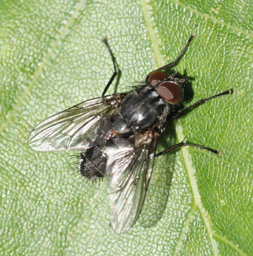 The Muscina genus is characterised by a striped thorax, a red tip to the scutellum and the discal vein turning up so that the first posterior cell is narrowed towards the wing apex.