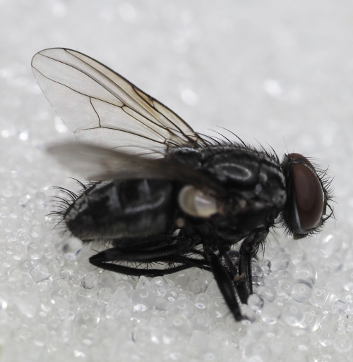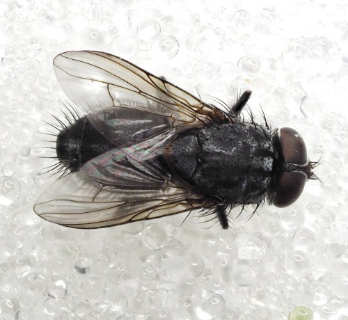 There are four UK species. Muscina levida is 6-8.5mm, has black legs, black antennae and palps, and a posterior cell that narrows gradually so that the width at the wing tip is about 70% of the widest part of the cell.