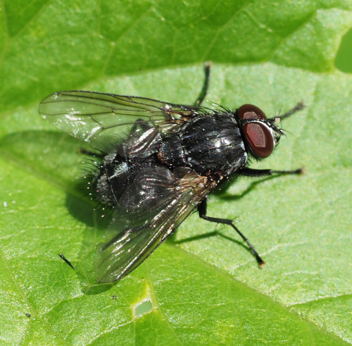 Muscina pascuorum is similar to M. prolapsa but is larger, has black legs, red palps and all-black antennae.