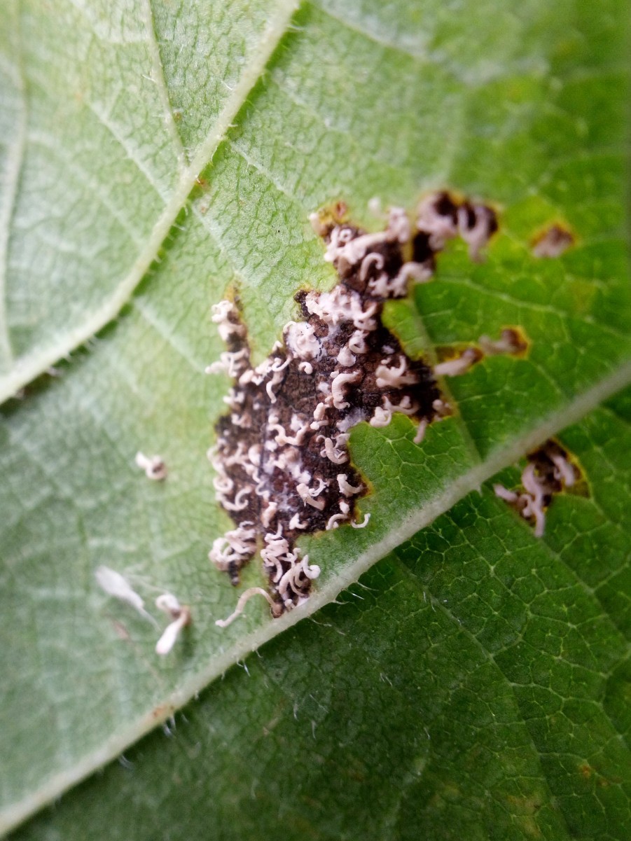 Phloespora ulmi is a fungal plant pathogen that affects the leaves of Elm species, usually recorded as the asexual anamorph. Irregular brown spots in yellow patches appear on the upperside of the living leaf. Underneath, white strands of conidia emerge from small brown spots, or acervuli. Eventually the underside of the leaf is covered in white fuzzy masses of conidia. Each conidia is falcate (sickle- or banana-shaped)