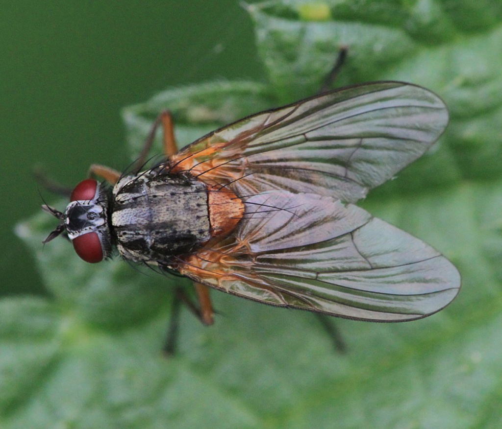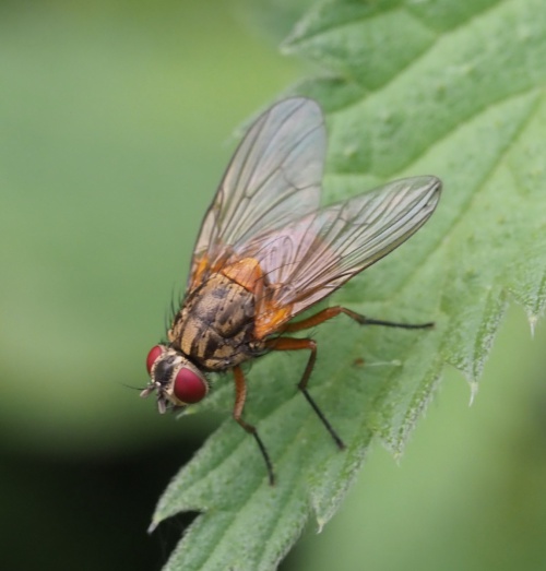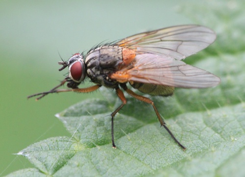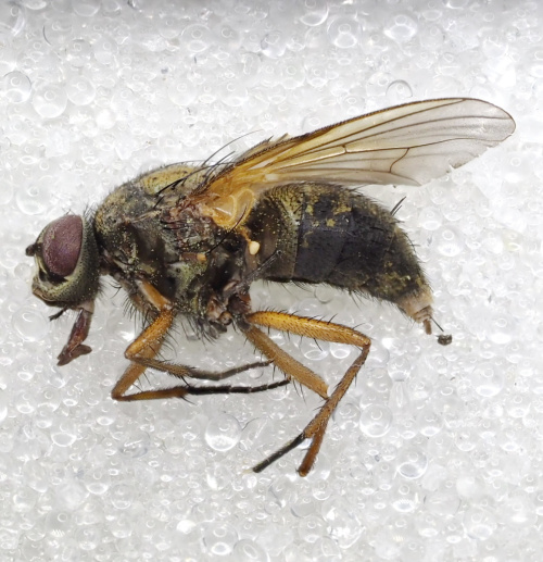 Mydaea is a genus of Muscidae flies characterised by having wing bristles on both dorsal and ventral surfaces at the radio-cubital node. There are 13 UK species but so far only three have been found in Leicestershire and Rutland. Mydaea corni is the commonest of these. The red legs and scutellum together with the reddish yellow abdomen help to distinguish this species from others in the genus.