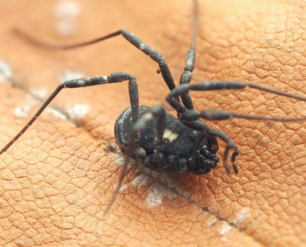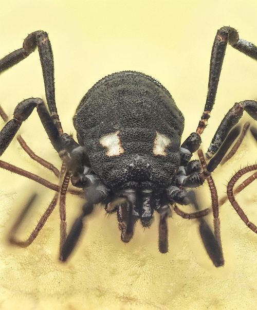 This is a small but distinctive harvestman. The white spots behind the head, pale stripe on the abdomen and relatively short legs make it easy to identify.