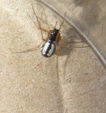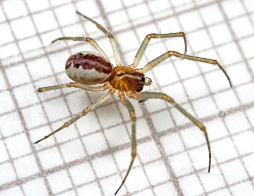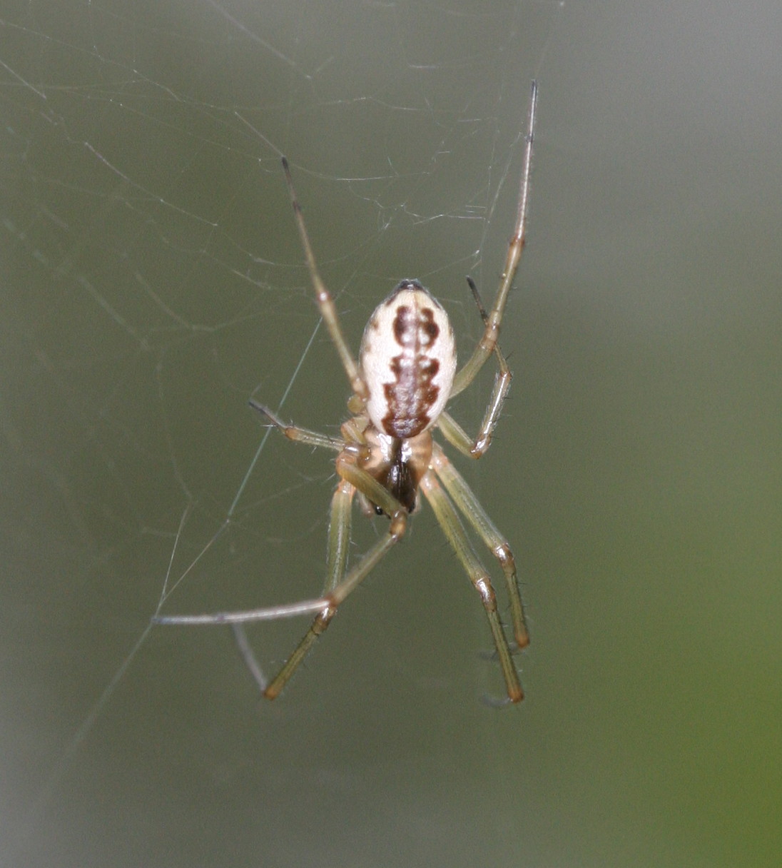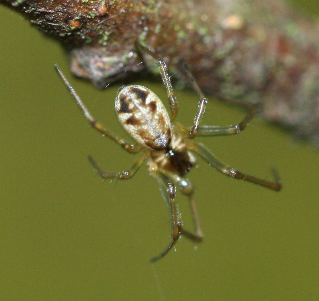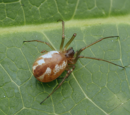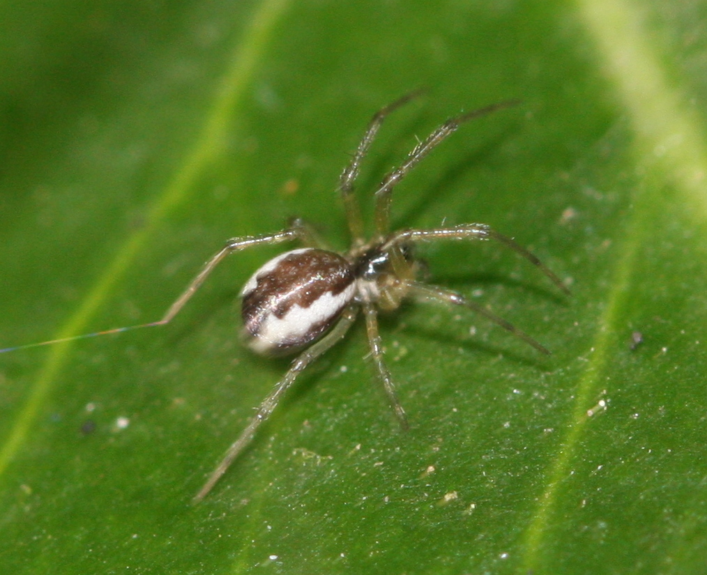 The carapace has a dark medial band which broadens to cover the head. The abdomen has a brown band with zig-zag edges. The legs are unmarked.