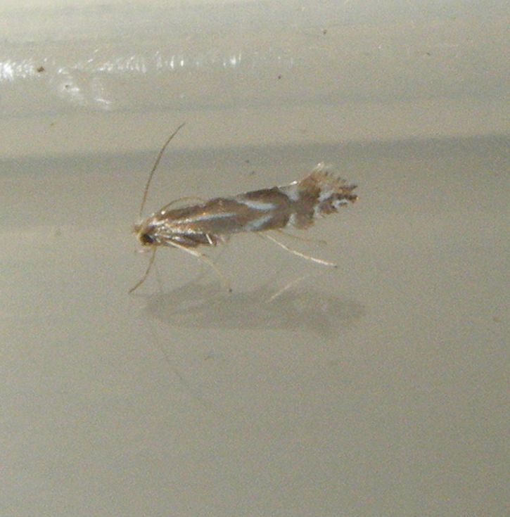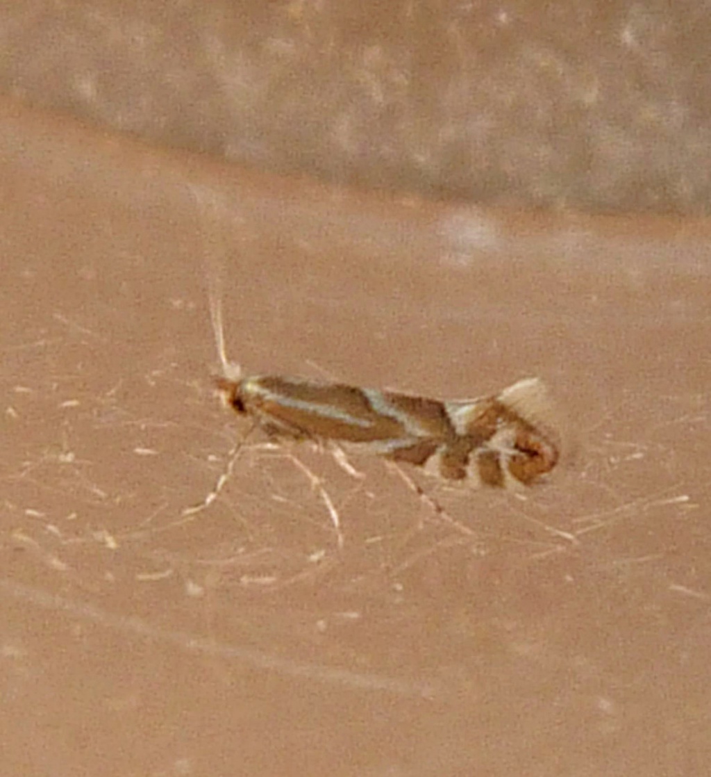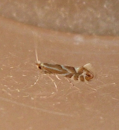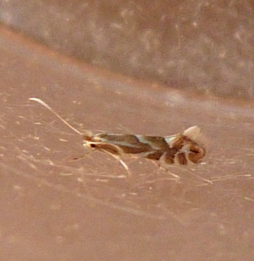 Wingspan 7 to 9 mm. This is yet another very small, brown and white Phyllonorycter. The details of the patterning require very careful examination to determine the species and expert confirmation should be sought. The larva mines the leaves of Hazel, causes a rounded mine on the upper surface of leaves; the mine has a white papery surface. Mature mines may cause the leaf to contract.
