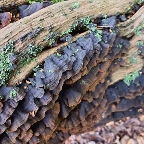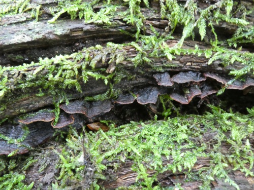 A perennial capped corticoid , very dark in colour with stiff convex cap and a dark reddish-brown fertile surface with projecting brown bristles (setae) - use a strong hand lens.