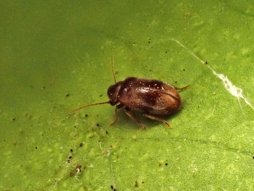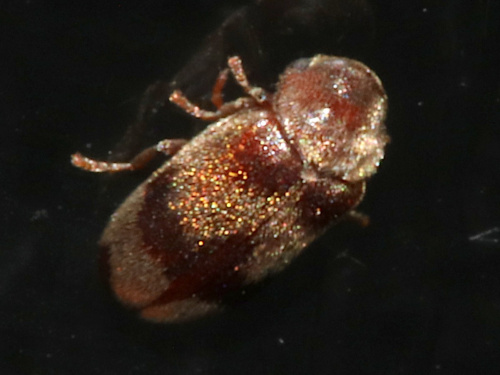 A small beetle 2.5 to 3.5 mm long. The brown elytra are usually tipped with red at the ends.