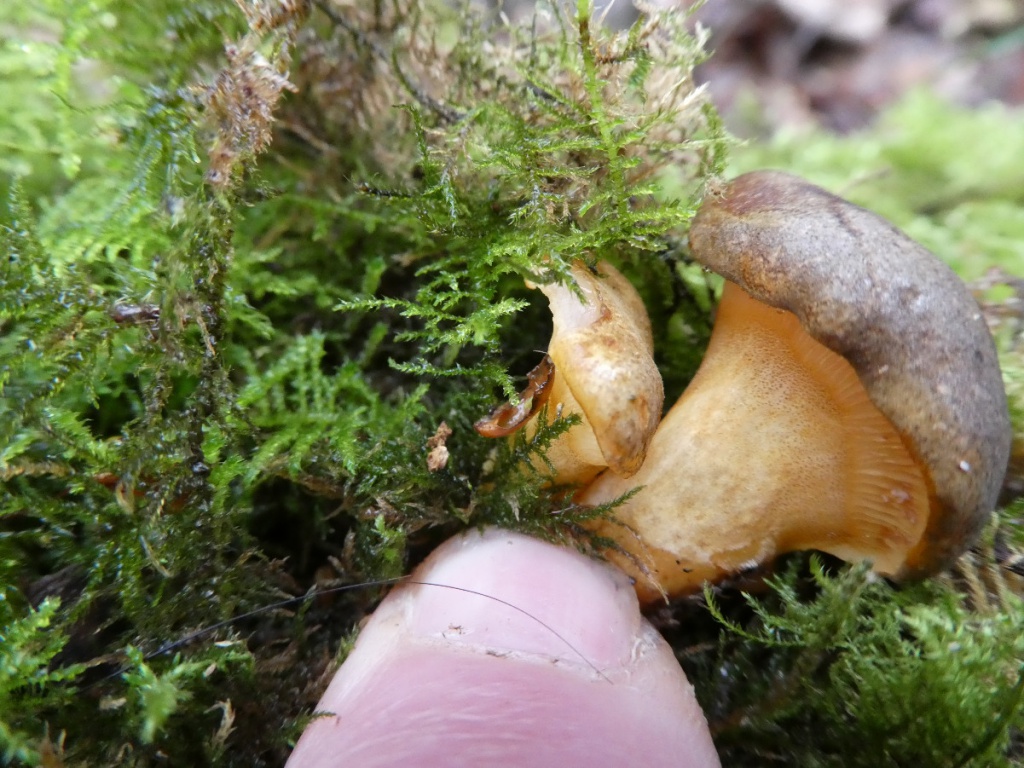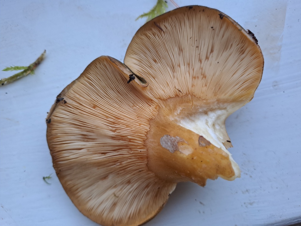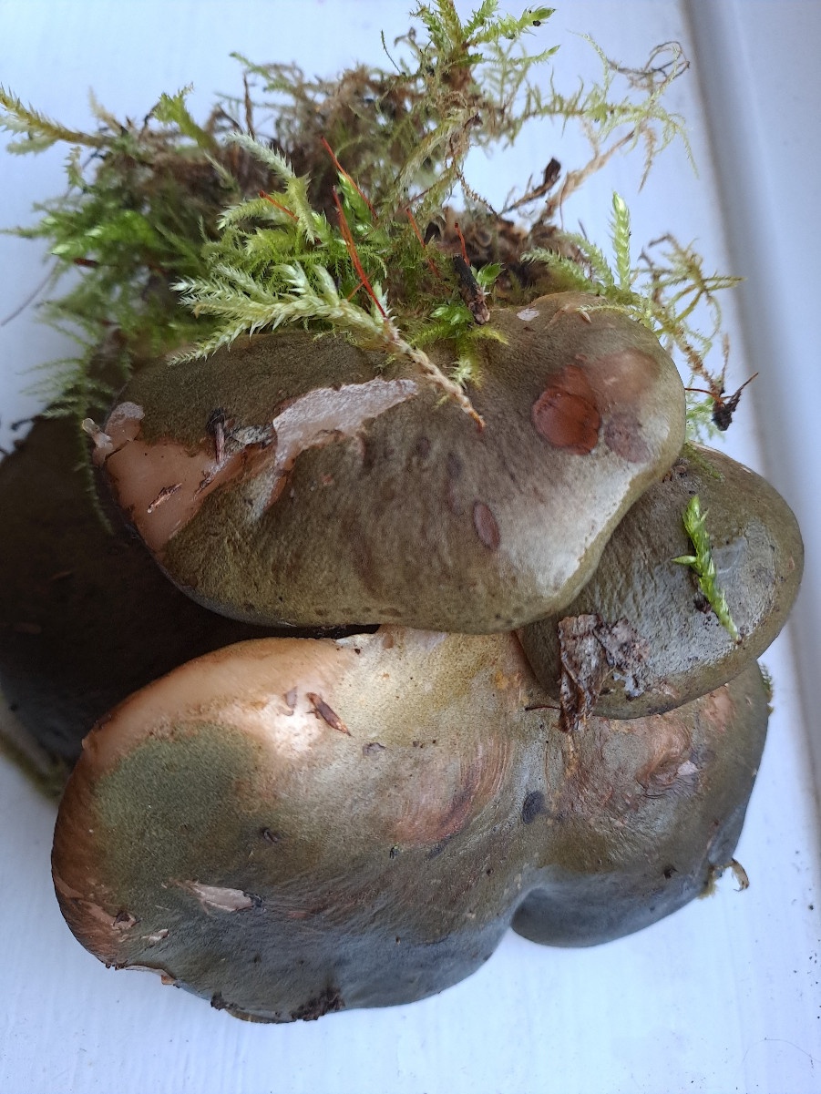 Kidney-shaped caps are fleshy and gelatinous, initially orange then olive green, eventually becoming greyish, slimy when wet. It has a short thick off-centre stipe. The gills are pale yellow to orange, and crowded. Spore print white, spores sausage-shaped.