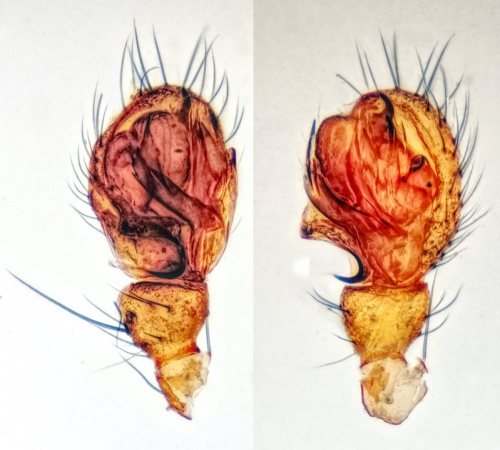 Male palp with slightly serrated end of lamella. Epigyne with flat scapus, hardly protruding. Lateral parts of epigyne approximately as long as wide, rounded.