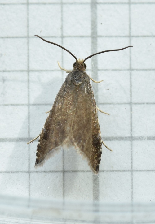 Wingspan about 12 mm. This species, despite its dull appearance, is relatively easy to recognise. It has a dark brown quite plain appearance, with a series of creamy-coloured strigulae along the costa, interspersed with occasional bluish-metallic streaks.