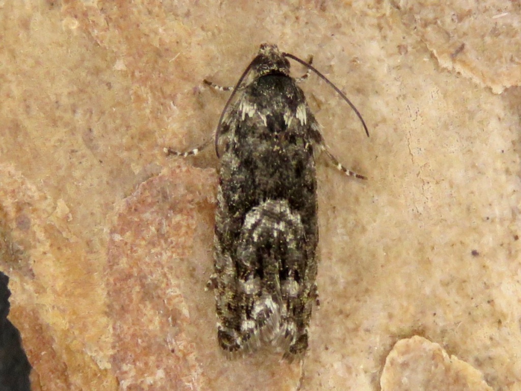 Wingspan about 15 mm. This species is distinctive for its rather long and narrow forewings, with a horseshoe-shaped whitish blotch on the dorsum. The hindwings are whitish with a dark border.